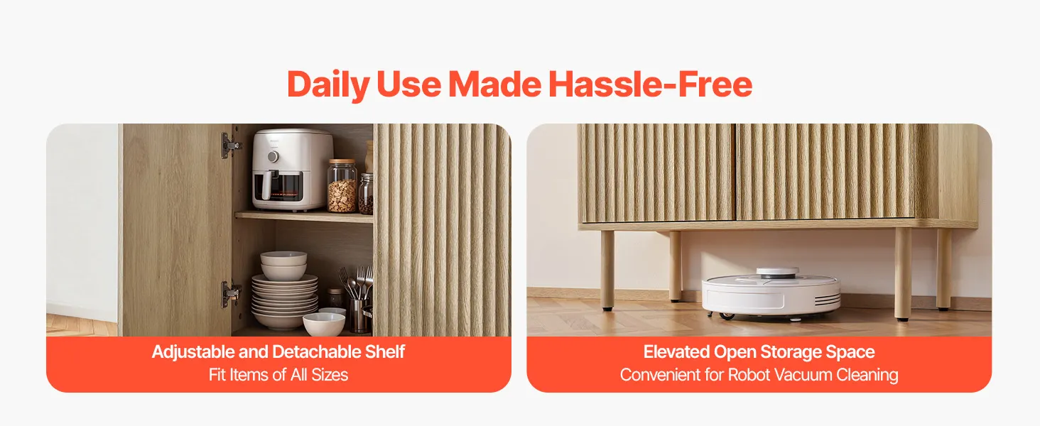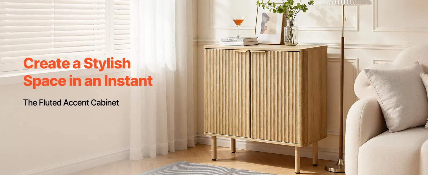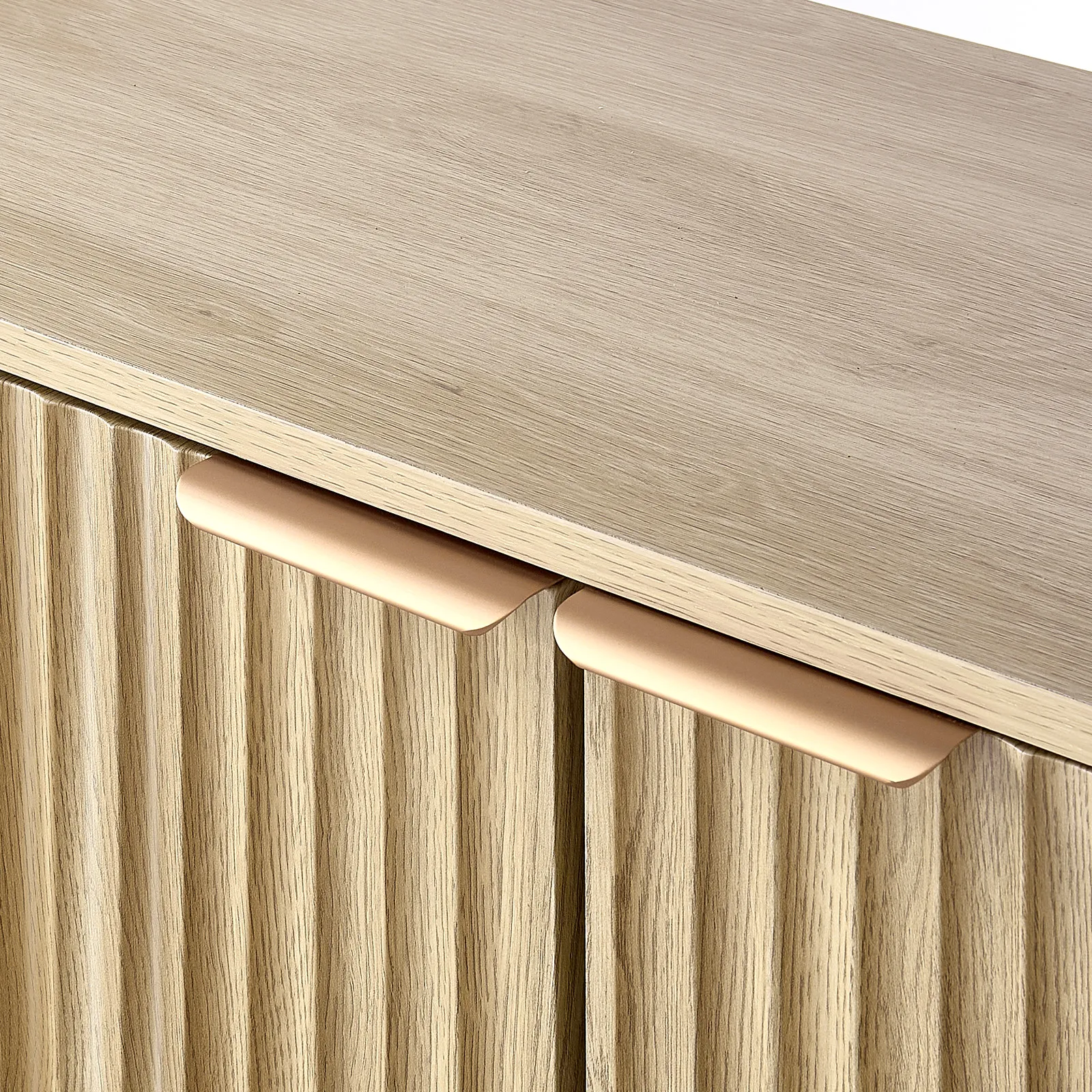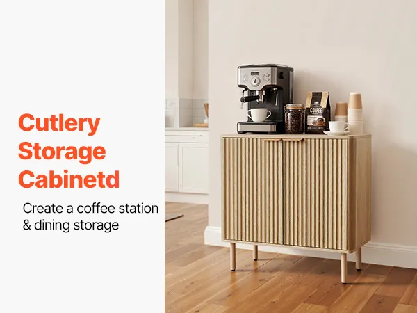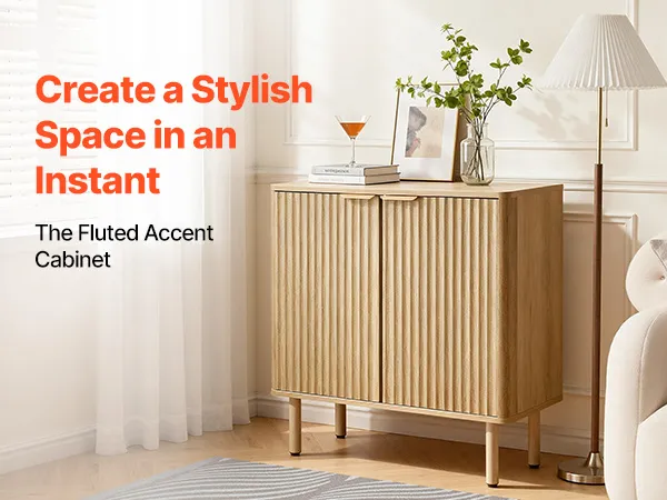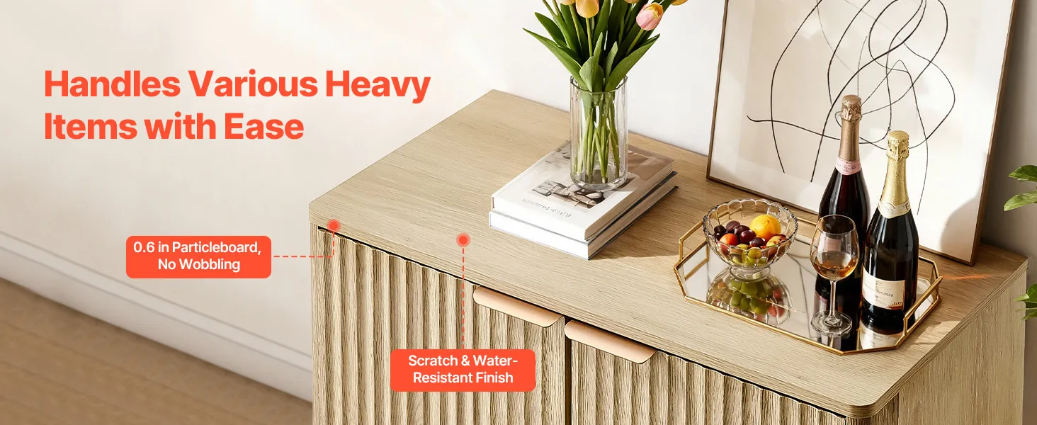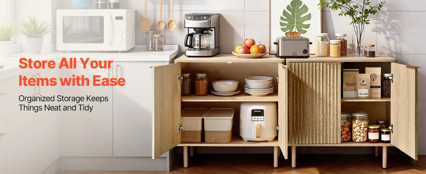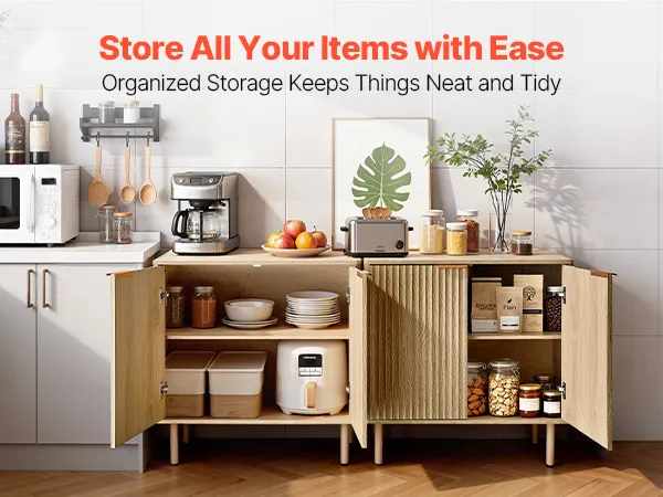 Elegant Fluted Design: This coffee bar cabinet features vertical fluted panels and sleek curved silhouette that add elegance to your home. The natural wood finish and metal handles blend modern and mid-century styles, making it both a stylish accent cabinet