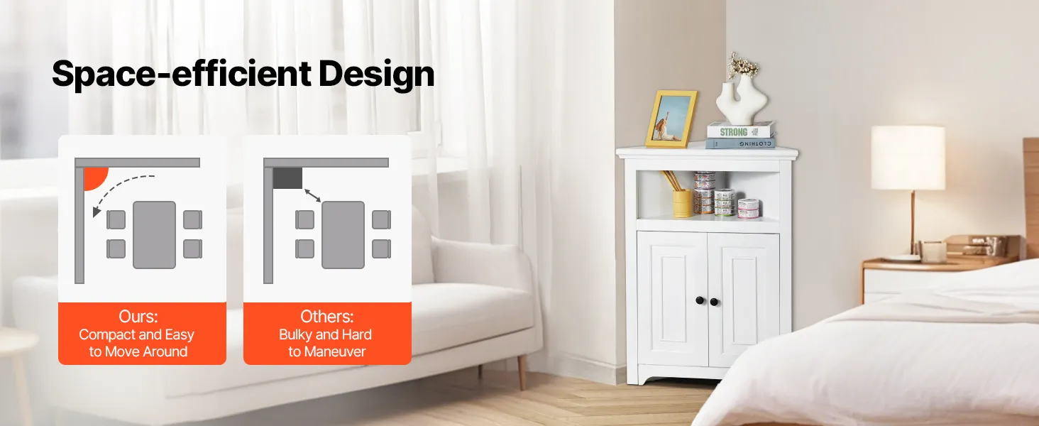 Smart Storage Layout: Featuring a combination of closed storage and open display shelves, this corner table with storage allows you to store less-used items on top, while keeping your everyday essentials in the lower cabinet. Show off books, headphones, or cute decor in the middle. Practical and stylish, all in one!