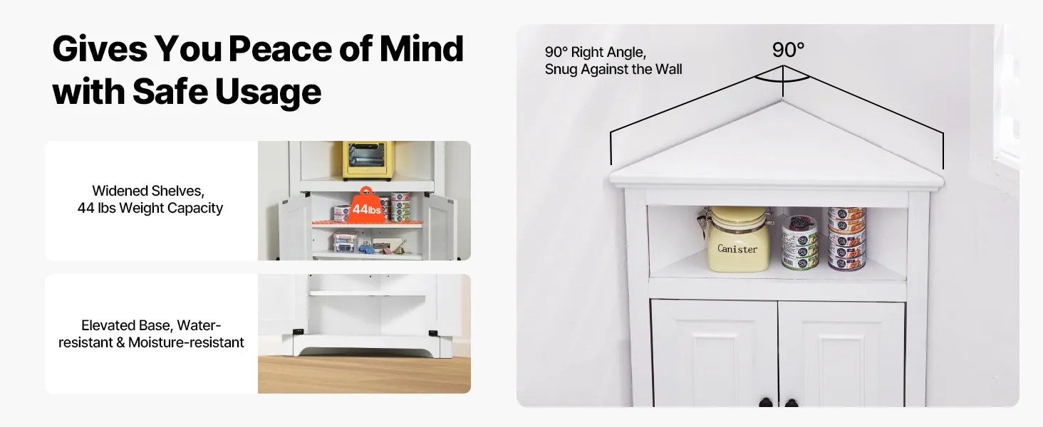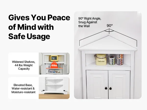 The cabinet fits securely in the corner with right-angle edges that hug the walls, ensuring stability. The thickened shelves can support up to 44 lbs/20 kg each, so you can confidently store heavier items like a small toaster oven. The elevated base is designed to be waterproof & moisture-resistant.