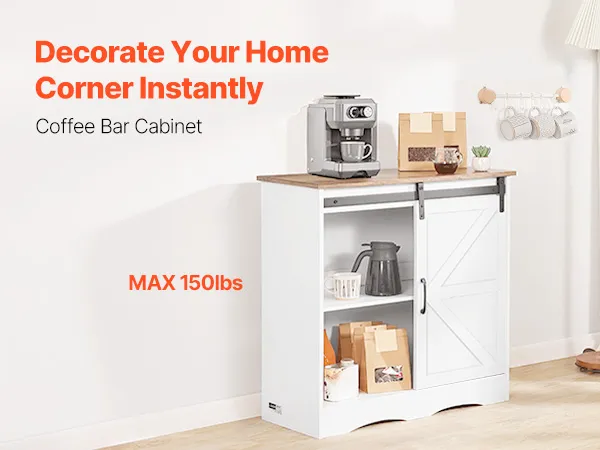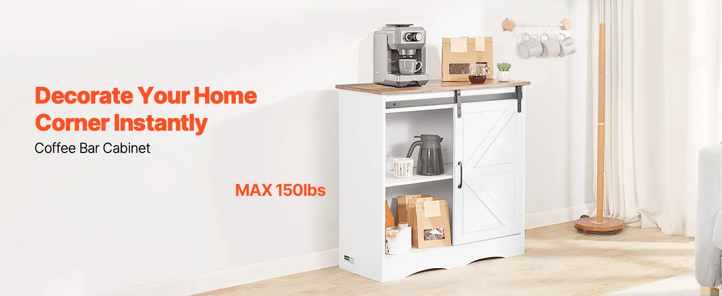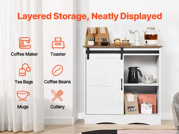 This farmhouse coffee bar cabinet offers multi-tier storage for coffee tools, tableware, and small appliances. Made with high-quality materials, it features barn doors and metal handles for added elegance. Easy assembly with an anti-tip device for stability.