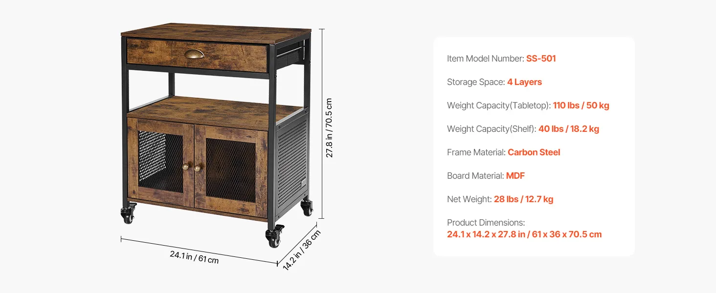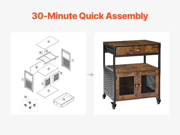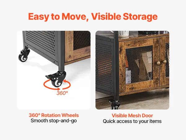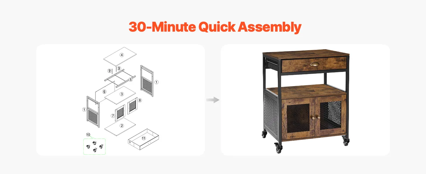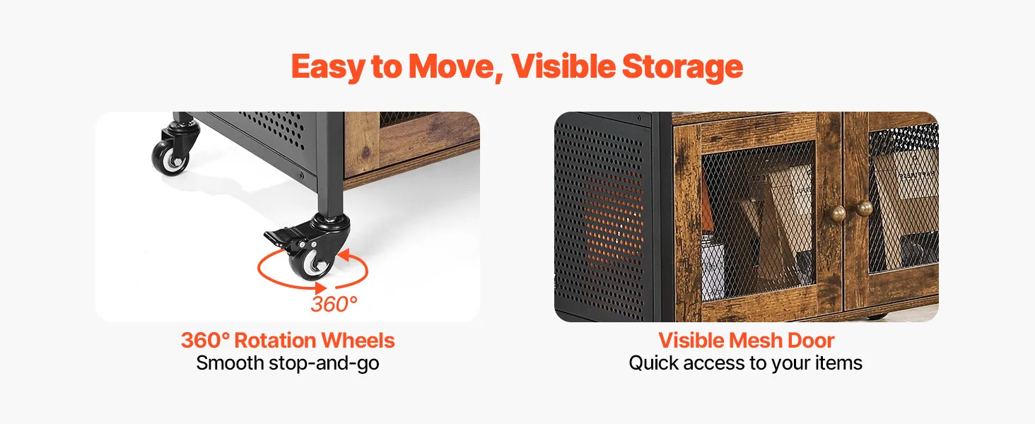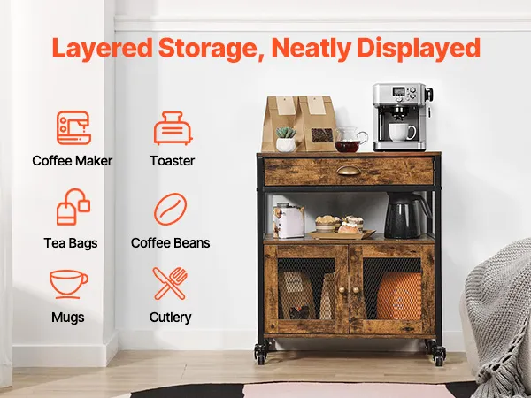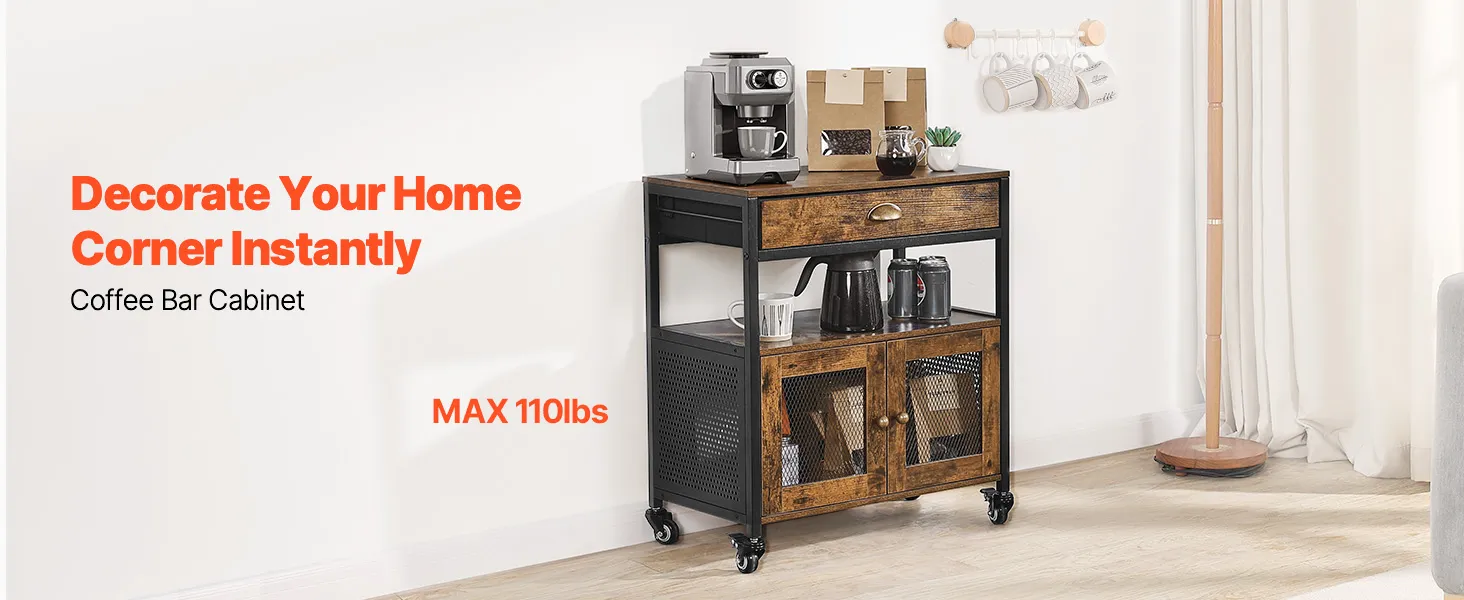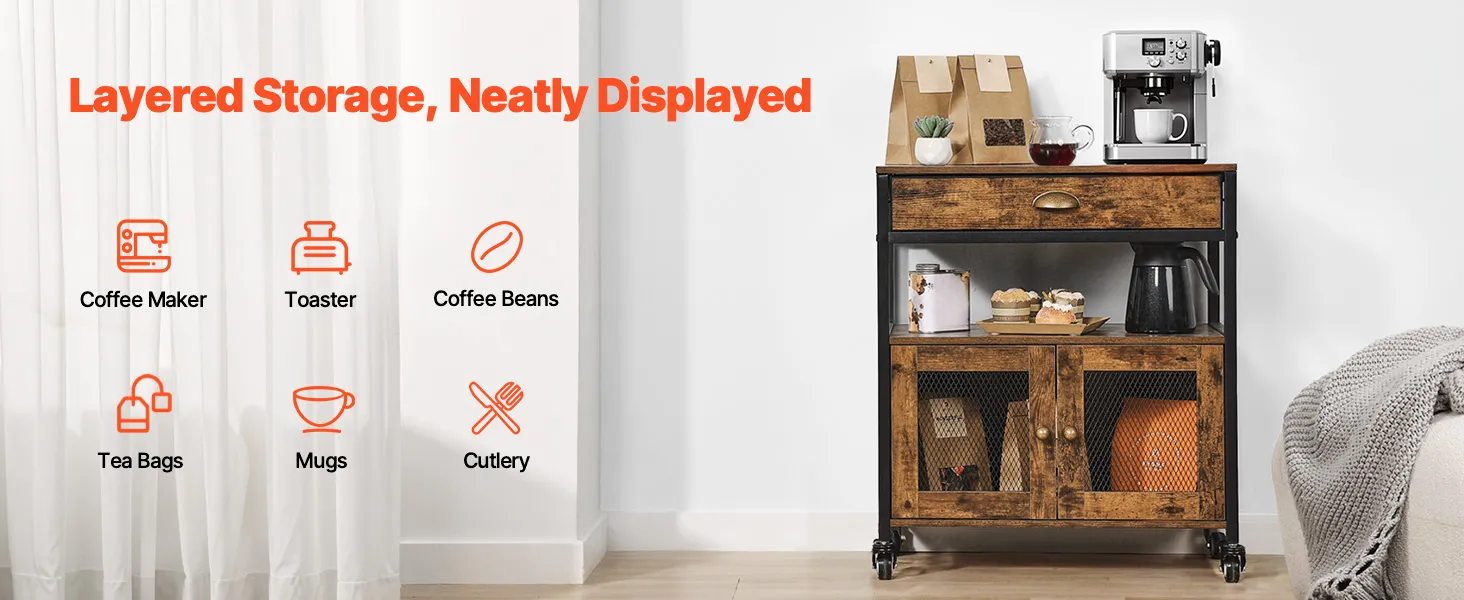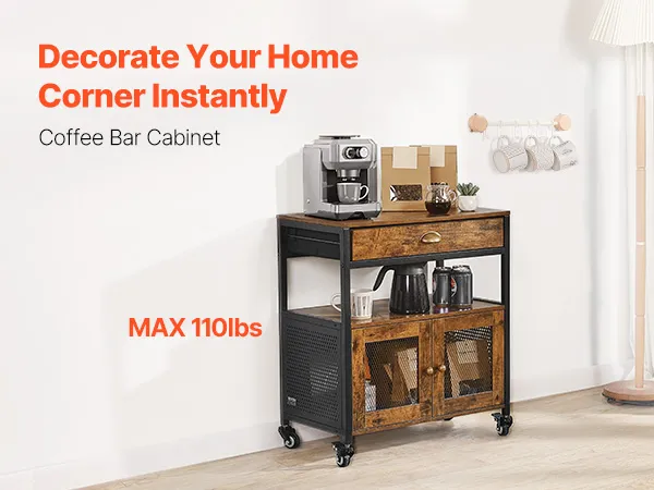 Easy Setup & Use: Assembling this coffee station cabinet is simple, with clear instructions and labeled parts. It features smooth, silent wheels for easy movement and floor protection, with two lockable wheels to keep it in place. The mesh doors provide visibility for easy access to your items.