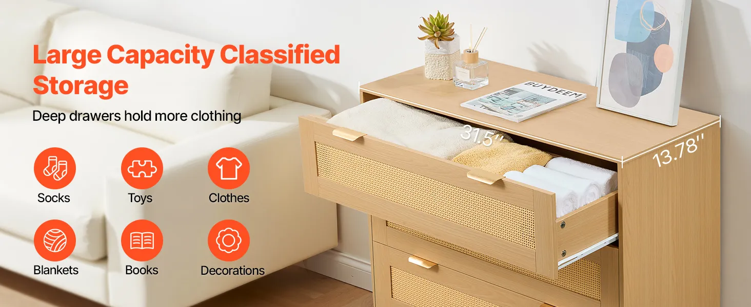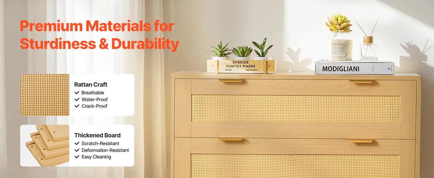 Onze rotan kast is voorzien van metalen handgrepen voor een comfortabele grip en soepel lopende lades. De stevige poten en het anti-kantelmechanisme zorgen voor betrouwbaar gebruik, zijn bestand tegen dagelijkse slijtage en behouden hun als nieuw uiterlijk jarenlang.