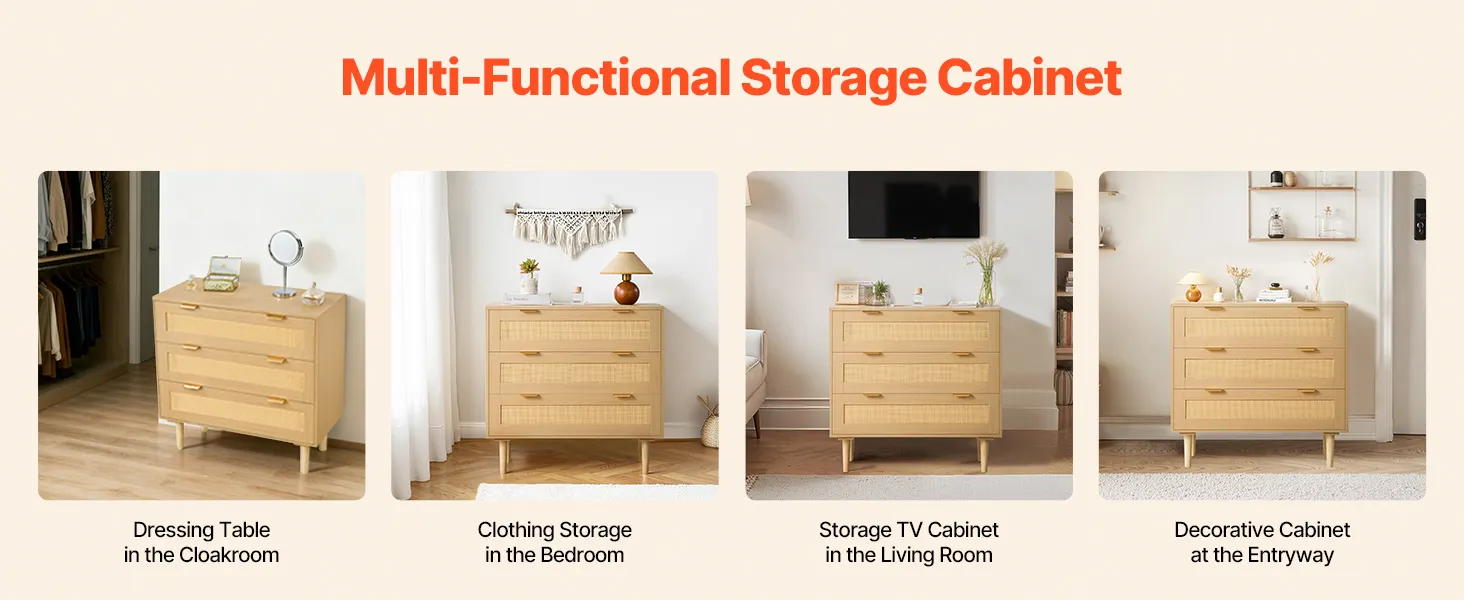 Ruime ladekast van rotan: Deze slaapkamerladekast van rotan heeft drie lades van elk 18,8 cm diep, waardoor er voldoende opbergruimte is voor kleding, boeken, dekens en speelgoed. Het brede oppervlak is ideaal voor het tentoonstellen van fotolijstjes en decoraties.