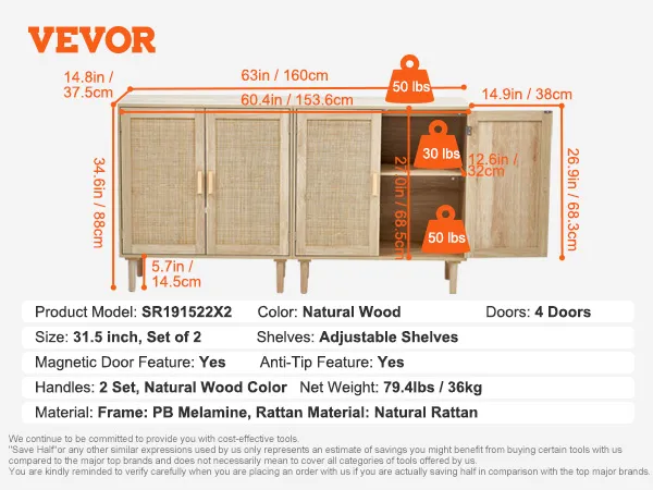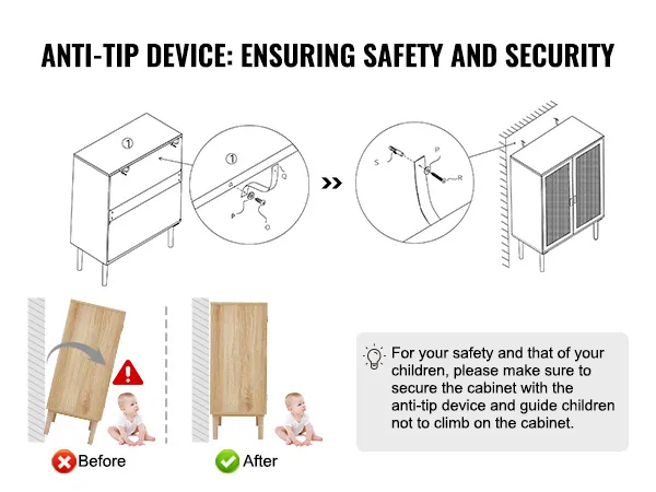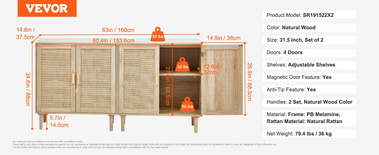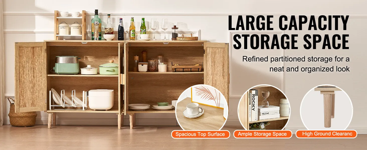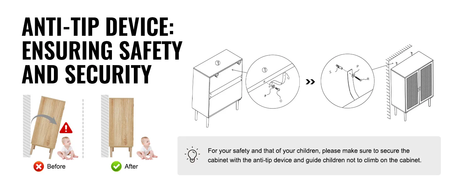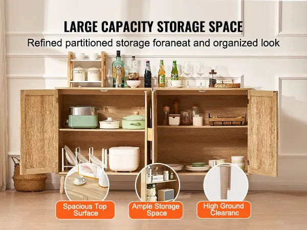 Stabiele en robuuste constructie: onze buffetkast wordt gekenmerkt door een hoog draagvermogen en stabiliteit. De bovenste plank ondersteunt maximaal 22,7 kg (50 lbs), de binnenste planken 13,6 kg (30 lbs) en de onderste plank ondersteunt 22,7 kg (50 lbs). Hierdoor is hij geschikt voor zware voorwerpen zoals koffiemachines en kleine ovens. Er wordt een anti-tip meegeleverd en wij raden aan deze te installeren voor extra veiligheid en stabiliteit.