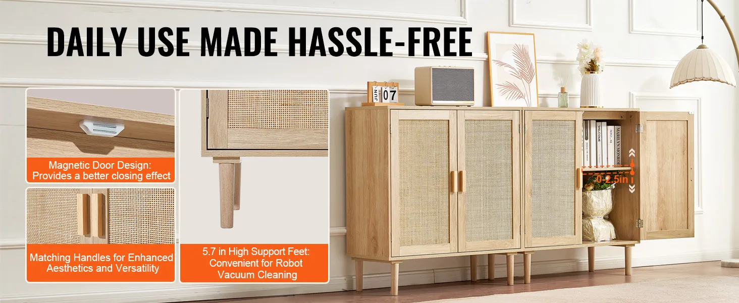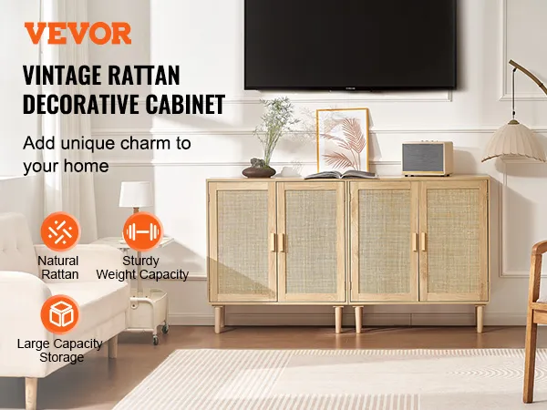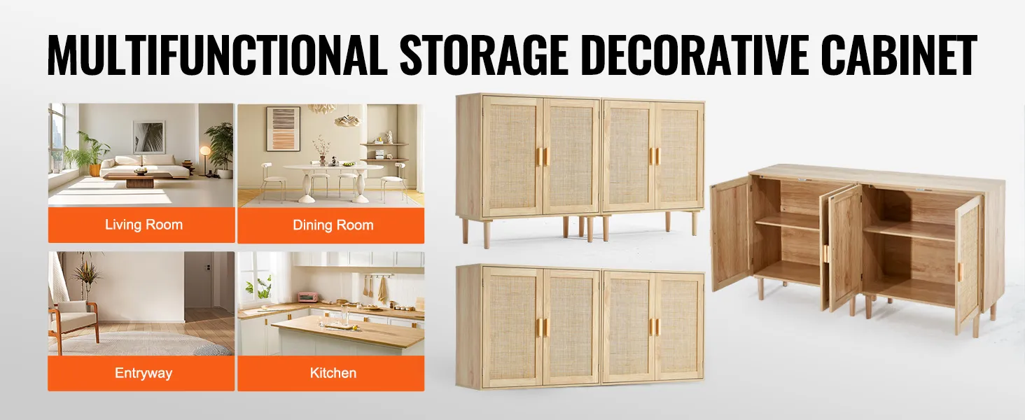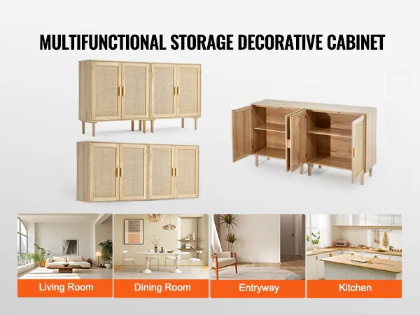 MULTIFUNCTIONEEL - Deze rotan buffetkast biedt de perfecte opbergoplossing en voegt stijl toe aan elke kamer. Het kan worden gebruikt als keukendressoir, barkast, slaapkameropbergmeubel of schoenenkast in de hal. De milieuvriendelijke materialen zijn veilig en gemakkelijk schoon te maken, waardoor deze kast geschikt is voor elke omgeving. Let op: Gebruik bij de montage geen elektrisch gereedschap.