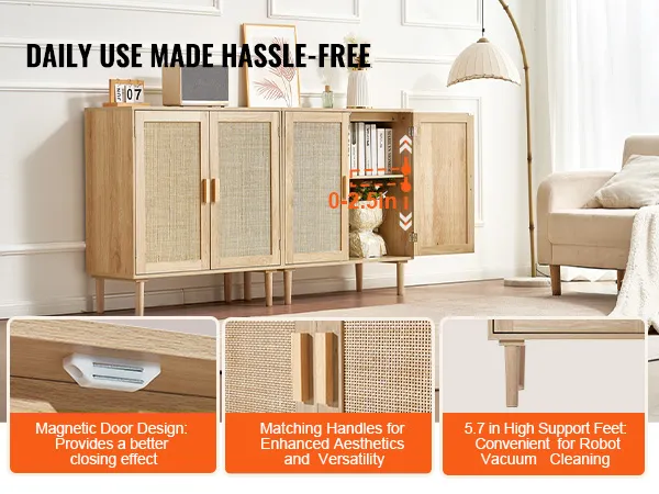 Vintage esthetiek: de ontwerper heeft vintage stijl gecombineerd met moderne esthetiek, waardoor deze rotan kast een unieke retro-chique uitstraling krijgt. Het rotan op de kastdeuren is met de hand geweven door bekwame vakmensen, waarbij natuurlijk rotan vocht en warmte absorbeert, waardoor een perfect visueel effect ontstaat.