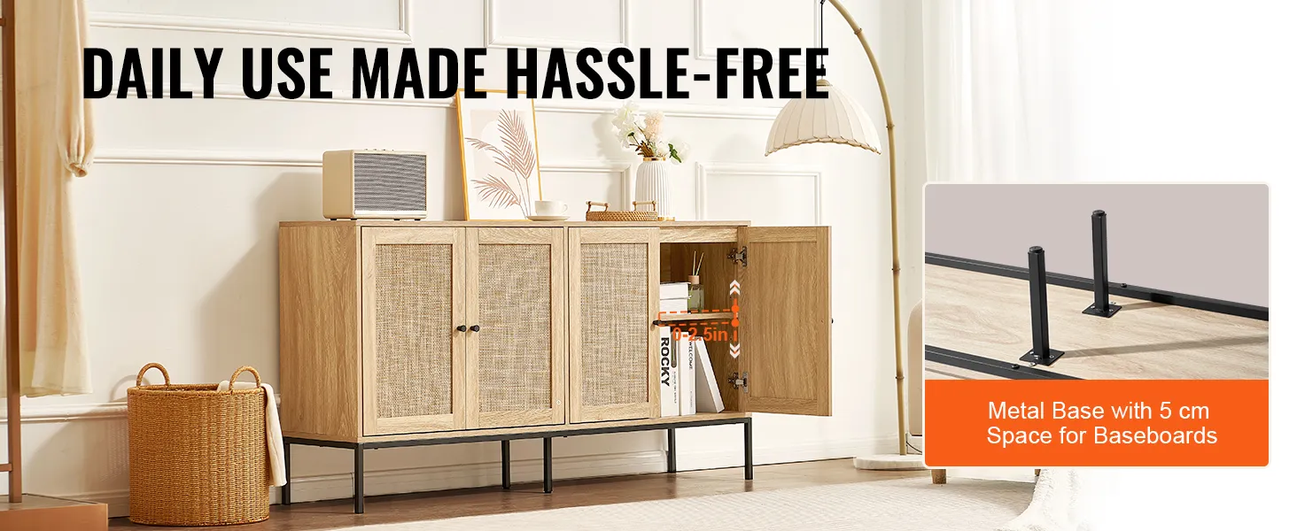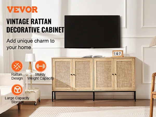 Ruime en verstelbare opbergruimte: deze rotan opbergkast is voorzien van rotan deuren die aan beide zijden opengaan om verborgen opbergruimte te bieden. De planken zijn in hoogte verstelbaar van 0 tot 64 mm, waardoor je de opbergruimte kunt personaliseren. Het biedt ruimte voor keukengerei zoals borden en glaswerk of andere benodigdheden zoals tassen, handschoenen en boeken.