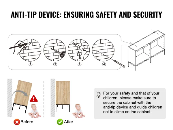 Onze buffetkast heeft een draagvermogen tot 36,3 kg. Een kantelbeveiliging is bij de levering inbegrepen. Om maximale stabiliteit en veiligheid te garanderen, moet het vóór gebruik worden bevestigd.
