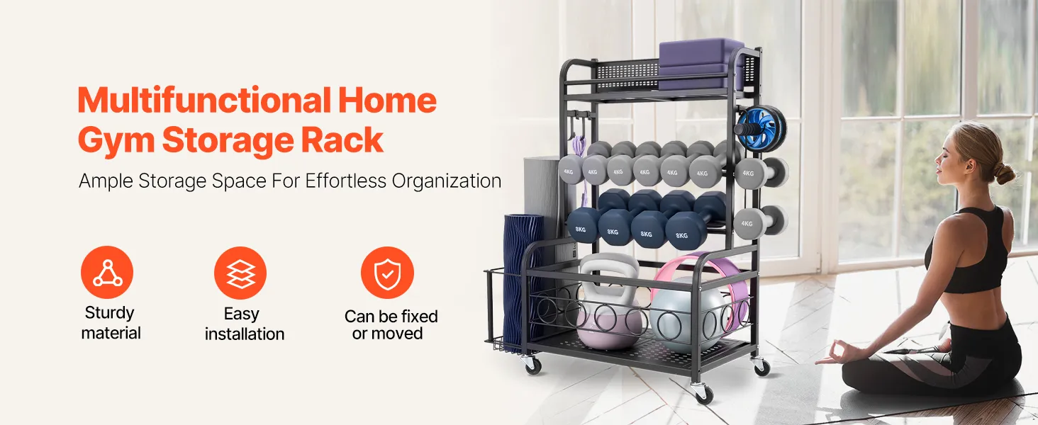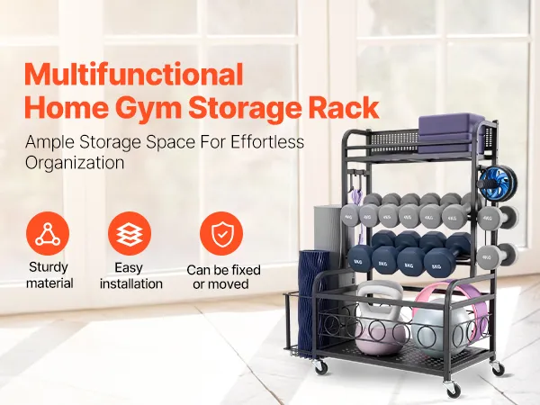 The home exercise and fitness gear organizer is made of high-quality powder-coated steel, ensuring a robust and long-lasting structure for years of use. The non-slip dumbbell slots are designed to prevent the risk of weights falling.