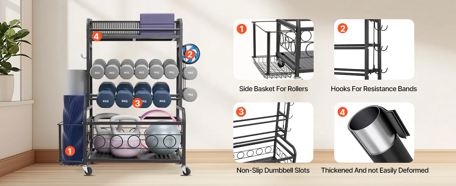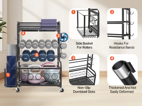 Sturdy and Durable Material: This workout equipment storage organizer is made from high-quality powder-coated steel. The rack can support up to 200 lbs (80 + 40 + 40 + 40 lbs). The non-slip dumbbell slots prevent the risk of weights falling