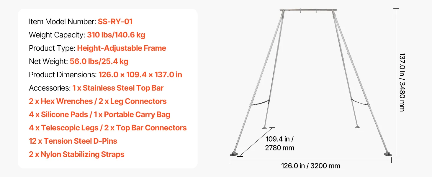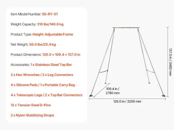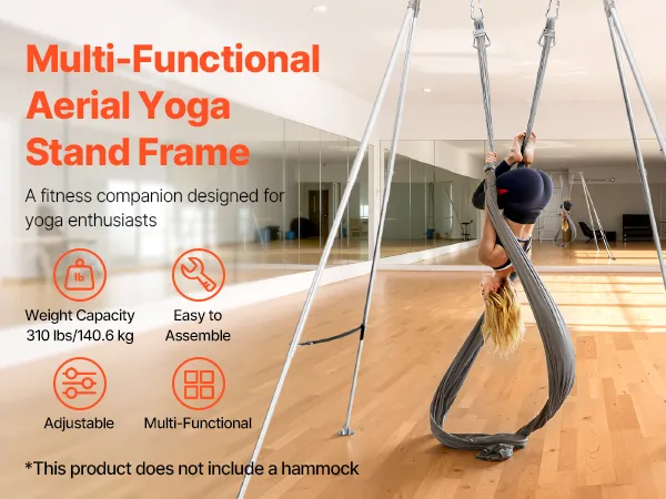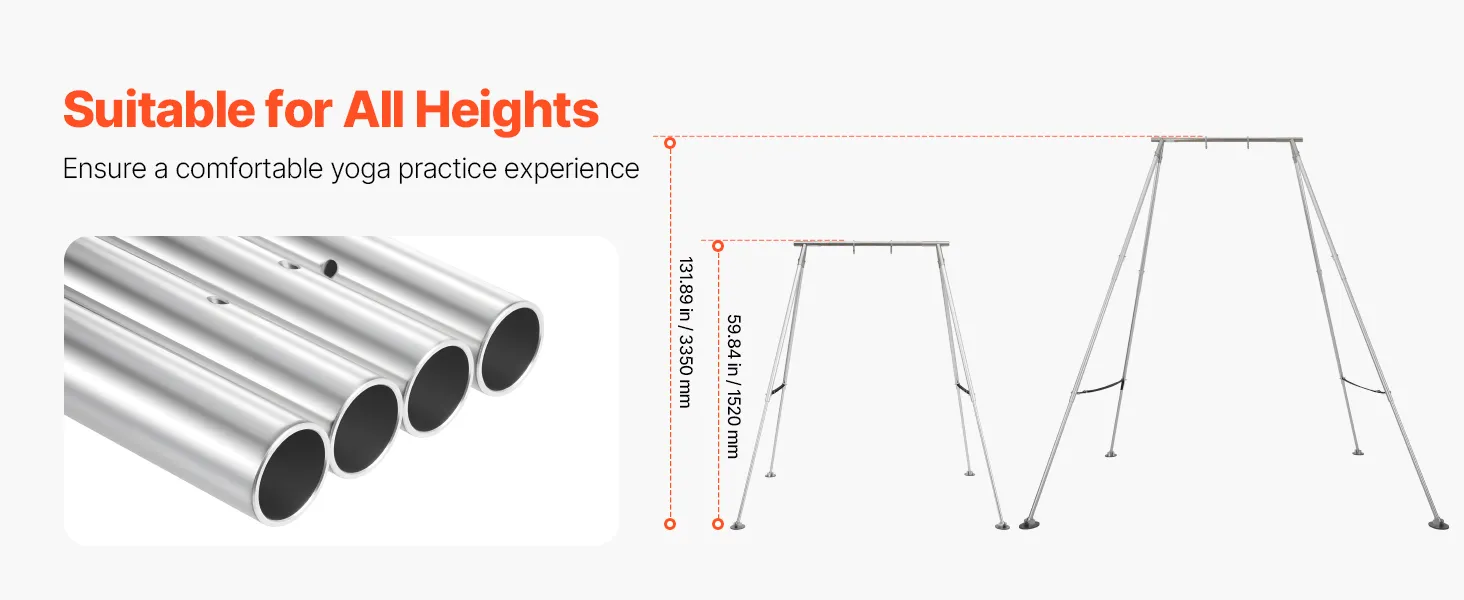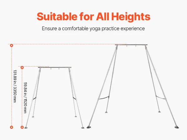 Hoogteverstelbaar systeem: Deze schommelstandaard voor aerial yoga heeft telescopische poten die verstelbaar zijn van 152 tot 335 cm (5 tot 11 voet). De gereedschapsloze montage maakt een eenvoudige aanpassing aan thuis, in de studio of op de camping mogelijk. De standaard is eenvoudig te gebruiken, zowel binnen als buiten, en past zich aan verschillende plafondhoogtes aan, waardoor er flexibele en onbeperkte ruimte is voor yoga of aerial training.