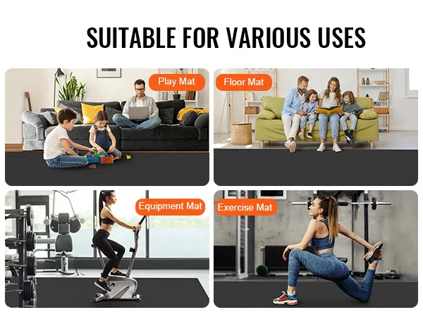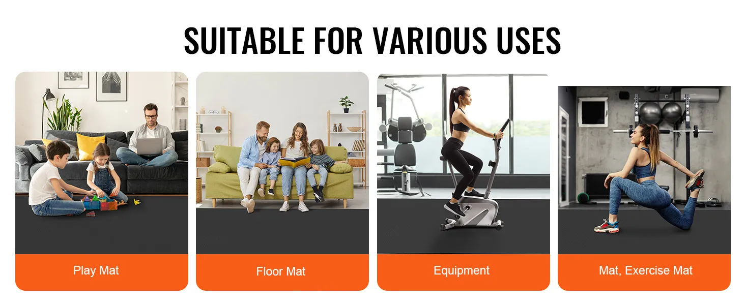 Suitable for Various Uses: Our fitness & exercise mat is suitable for all floor types, including carpets, tiles, or wooden floors in living rooms or bedrooms, as well as concrete floors in garages, patios, or basements. It can be used as a play mat, floor mat, equipment mat, or exercise mat.