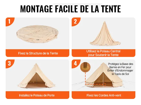 Setting up the bell tent is a breeze with just four simple steps. We also provide a camping tool kit, complete with stakes and a hammer, ensuring the tent's safety and stability. You can easily assemble it in no time, leaving you more time to enjoy your camping trip.