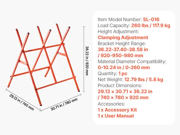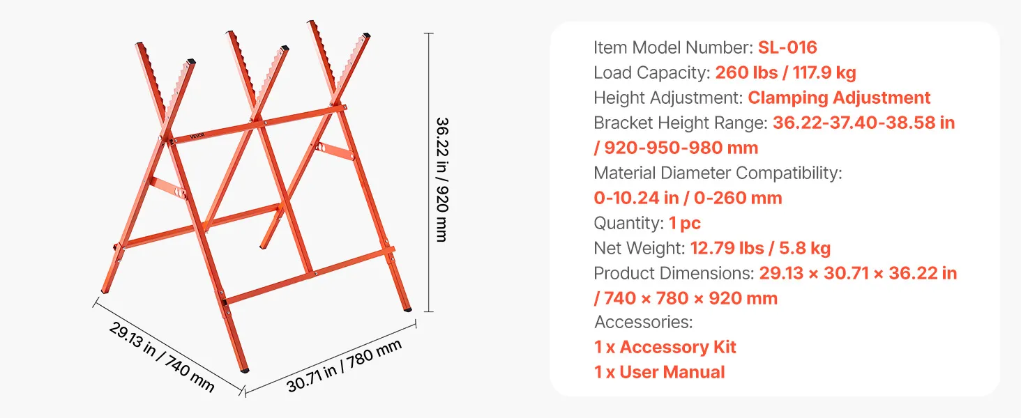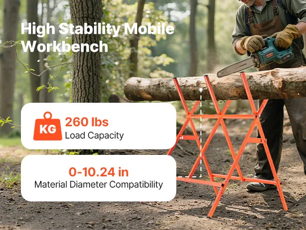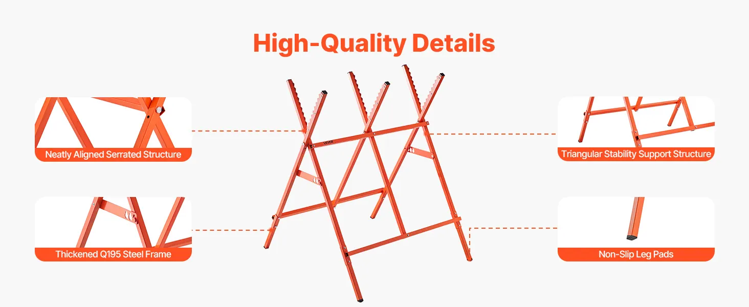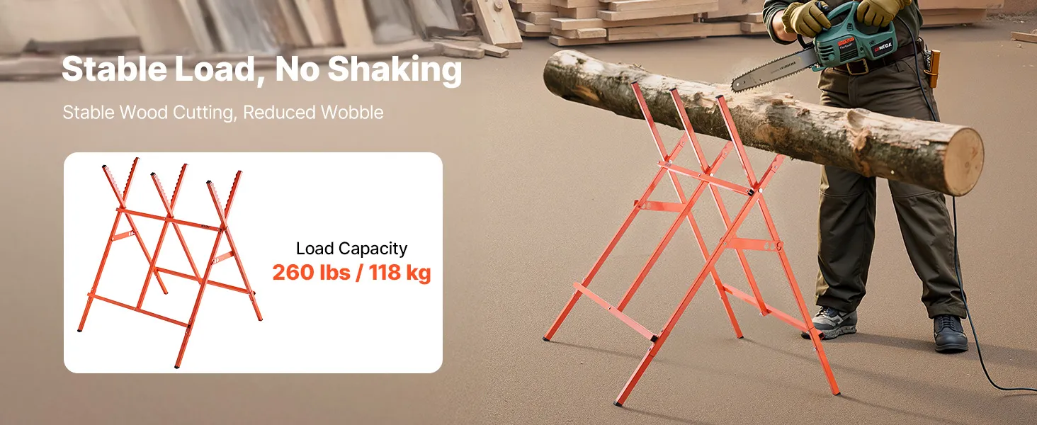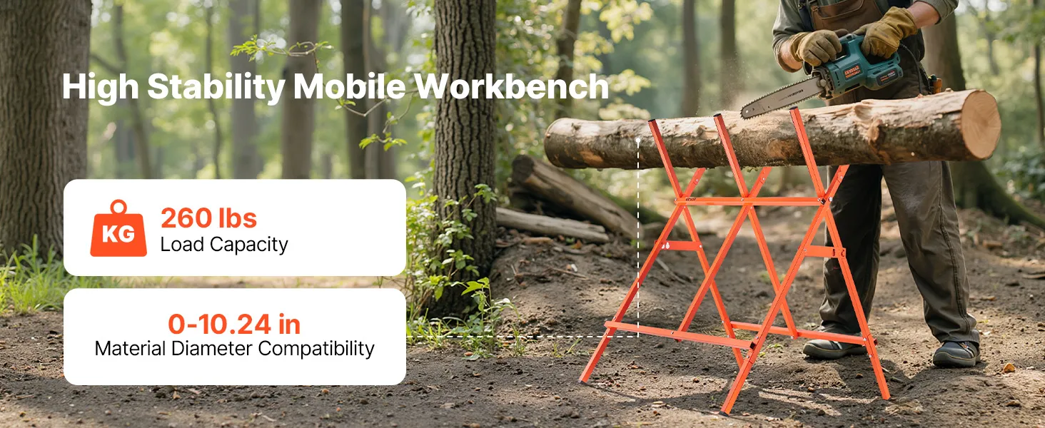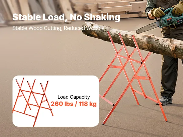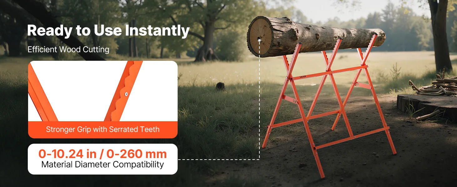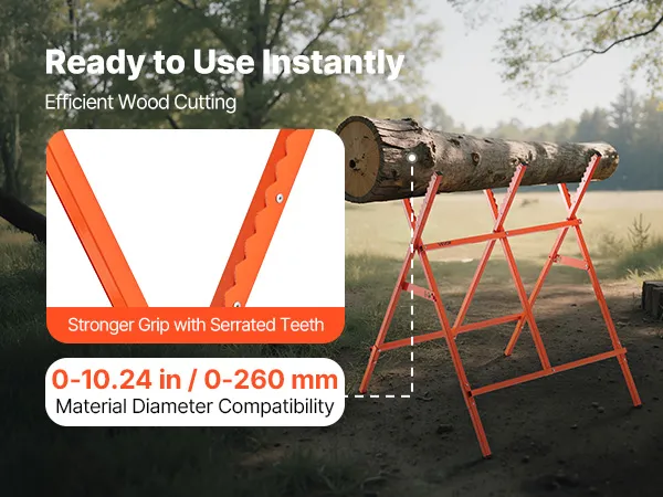 Antislipontwerp: Dit opvouwbare zaagframe is voorzien van rubberen pads en draaivergrendelingen die voor stabiliteit zorgen op hellingen, grind of natte grond, zodat u zware stukken hout kunt zagen zonder uit te glijden.