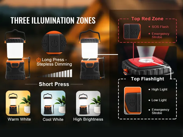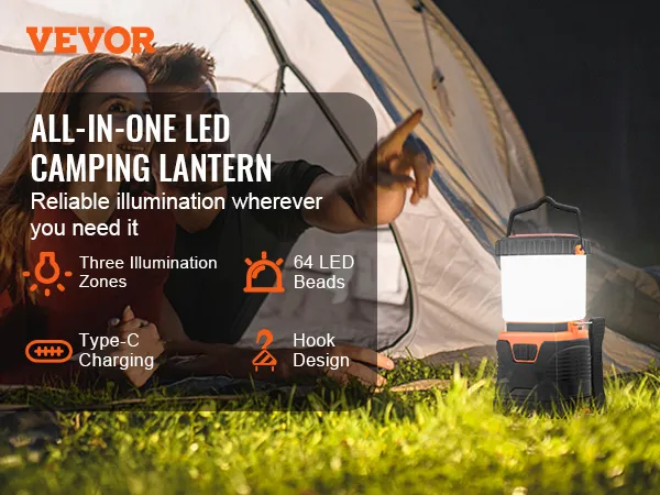 360° Full Range LED Lantern: Our LED camping lantern offers two illumination modes—flashlight and lantern—with 64 LED beads to light up any space easily. Ideal for brightening up your campsite or home, making sure you never miss a moment.