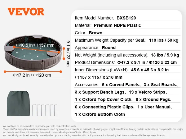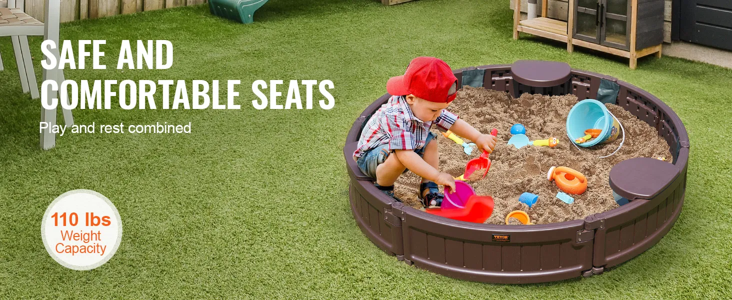 VEVOR Sandbox with Cover, 47.2 x 9.1 in Round Sand Box, HDPE Sand Pit with 3 Corner Seating and Bottom Liner, Kids Sandbox for Outdoor Backyard, Beach, Park, Gift for Boys Girls Ages 3-12, Brown