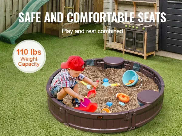 The sandbox with cover features 3 corner seats where children can rest when they are tired, preventing them from sitting directly on the sand for a cleaner and more comfortable experience. Each seat supports up to 110 lbs, providing a secure and enjoyable play environment for children.