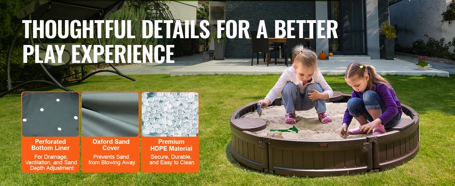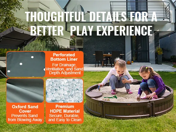 Weather-Resistant and Durable Materials: The sand box for kids is made of HDPE material, known for its excellent wear resistance and weather resistance, and has undergone rigorous environmental testing to ensure the health and safety of children. The sand cover and bottom are made of Oxford cloth, which can withstand various outdoor weather conditions. Note: The product does not include play-grade sand and toys.