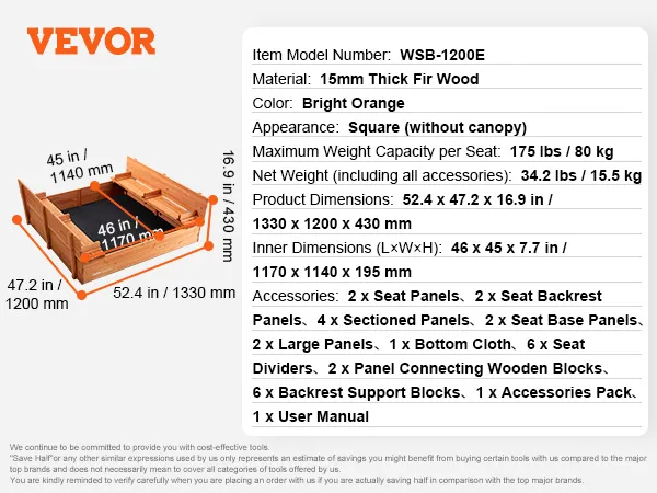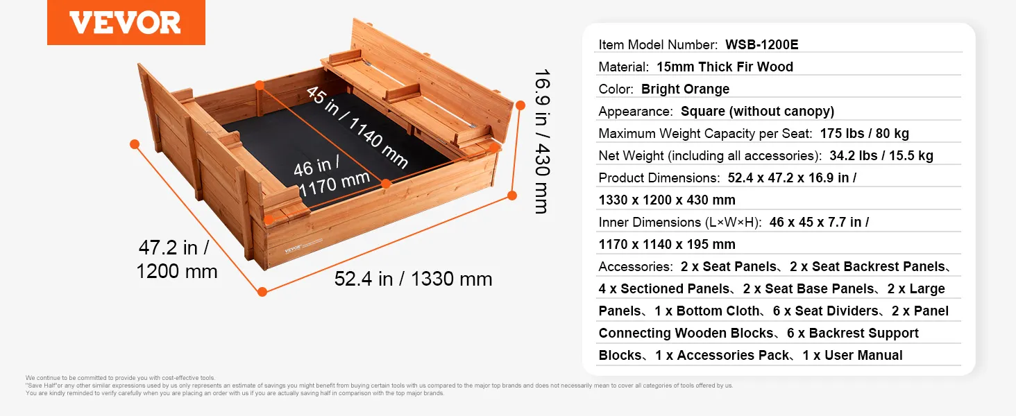 Children's Mini Playground: Our sand box is not just a play area but a place where happy childhood memories are made. With a size of 52.4 x 47.2 x 16.9 in / 1330 x 1200 x 430 mm it can accommodate 2-4 children playing together, turning your backyard or outdoor play area into a playground filled with exploration and laughter.