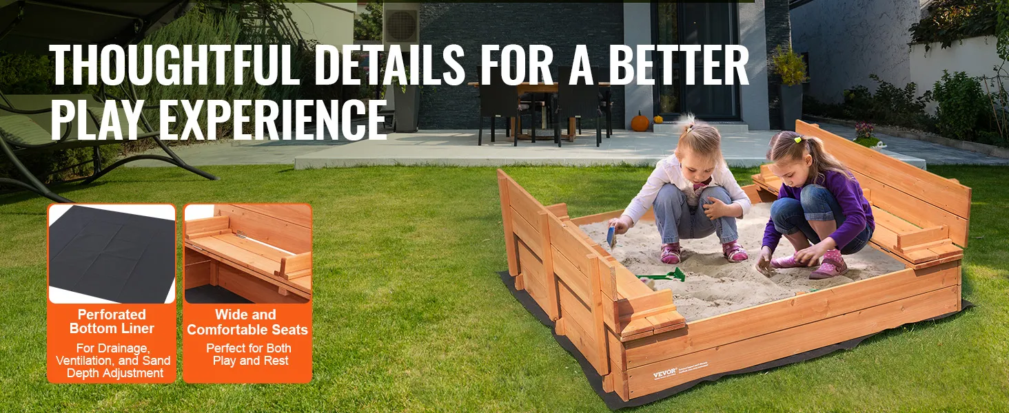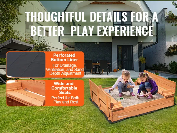 The perforated bottom liner promotes drainage and ventilation inside the sandbox for kids, preventing the sand from becoming damp. Kids can adjust the sand depth according to their needs. When not in use, the cover can prevent the sand from being blown away. The seats ensure comfortable play.
