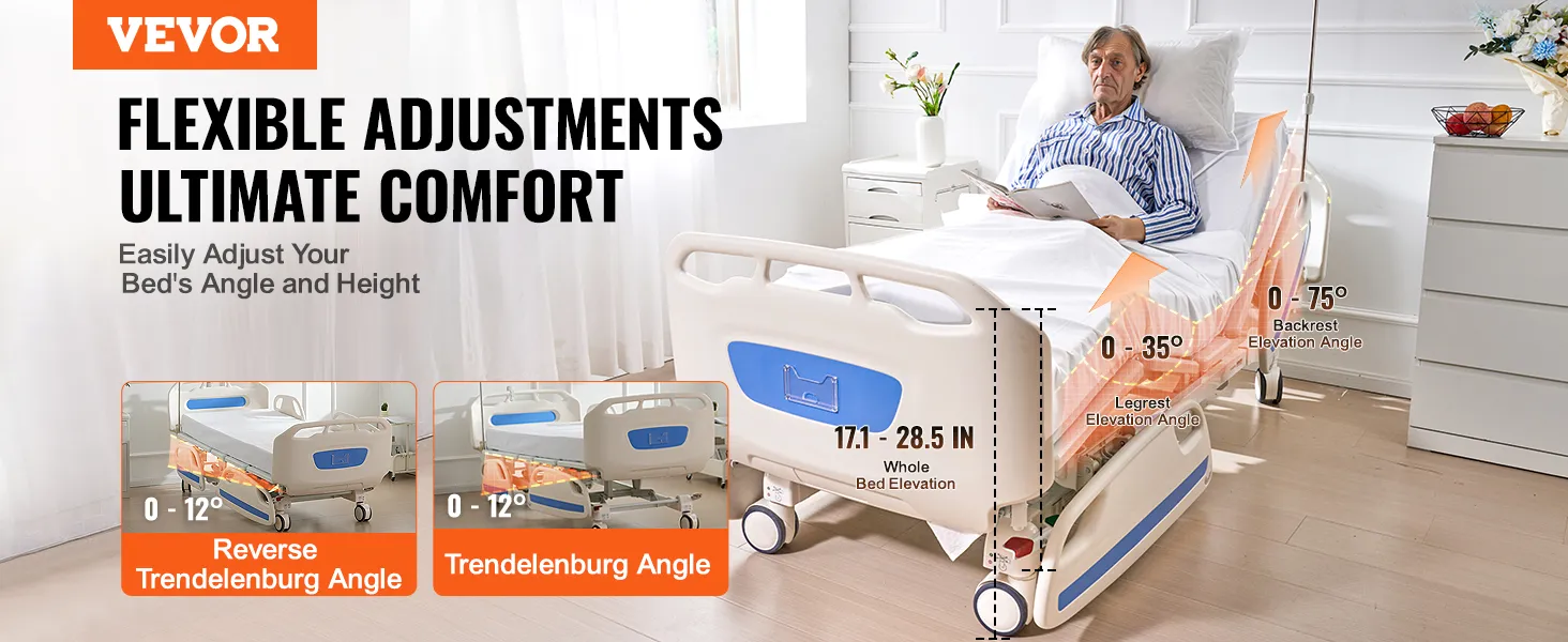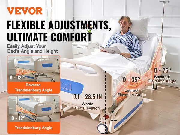 5 verbeterde functies: Ervaar ongeëvenaard comfort met het volledig elektrische ziekenhuisbed van VEVOR met 5 verstelbare functies. Pas uw positie moeiteloos aan met Trendelenburg- en anti-Trendelenburg-hoeken (0°-12°), volledige bedhoogte (17,1 - 28,5 inch), rugleuninghoek (0° - 75°) en beenpositie (0° - 35°) aan uw specifieke behoeften.