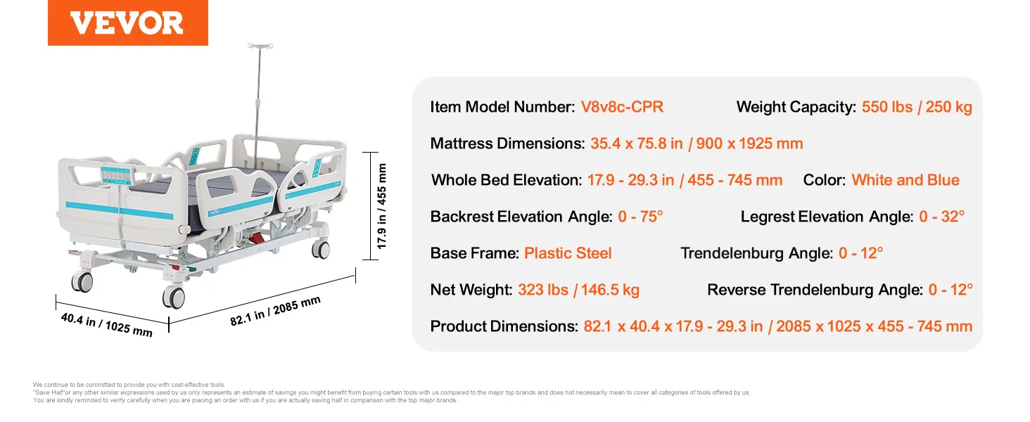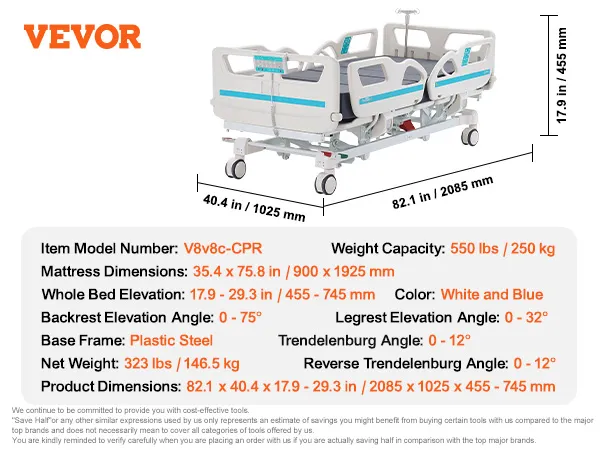 5 Upgraded Functions & Cardiac Chair Position: Experience unparalleled comfort with VEVOR full electric hospital bed, featuring cardiac chair position and 5 adjustable functions. Effortlessly customize your position with trendelenburg and reverse trendelenburg angle (0°-12°), full bed elevation (17.9 - 29.3 in), backrest angle (0° - 75°), and leg position (0° - 32°) to meet your specific needs.
