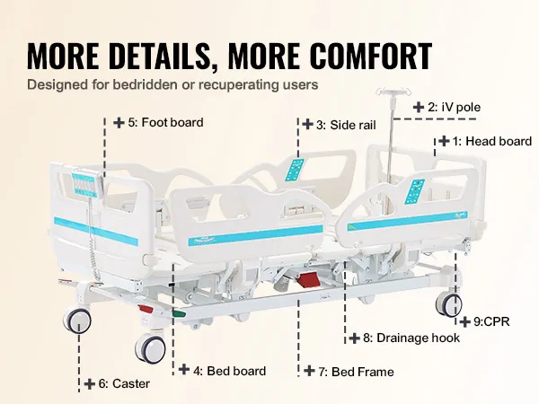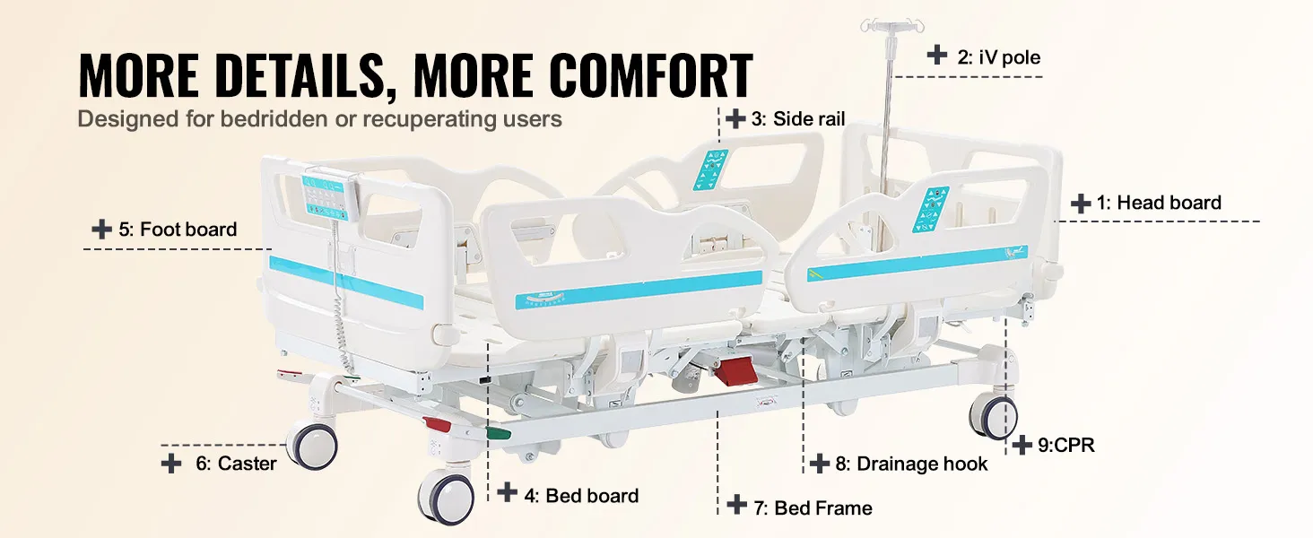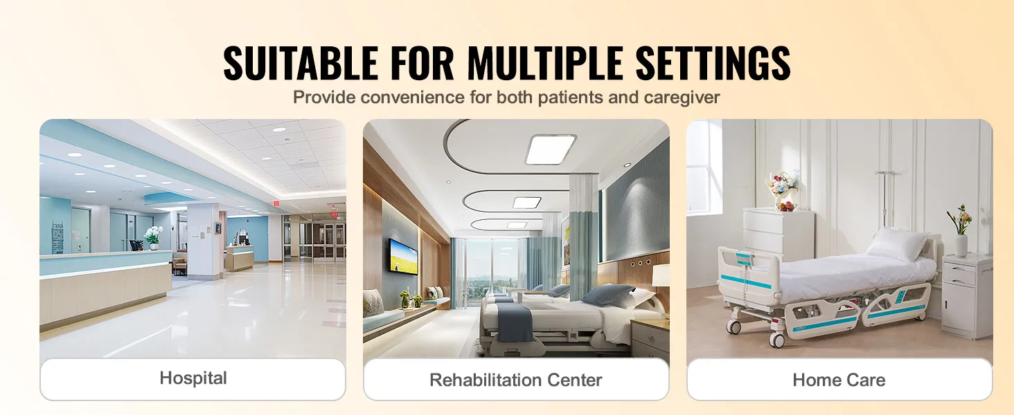Versatile Applications: Our 5-function full electric hospital bed is designed to fit seamlessly into various settings, including hospitals, rehabilitation centers, and home care environments. Whether you're undergoing rehabilitation treatment in a medical facility or need long-term care at home, this bed is your perfect companion.