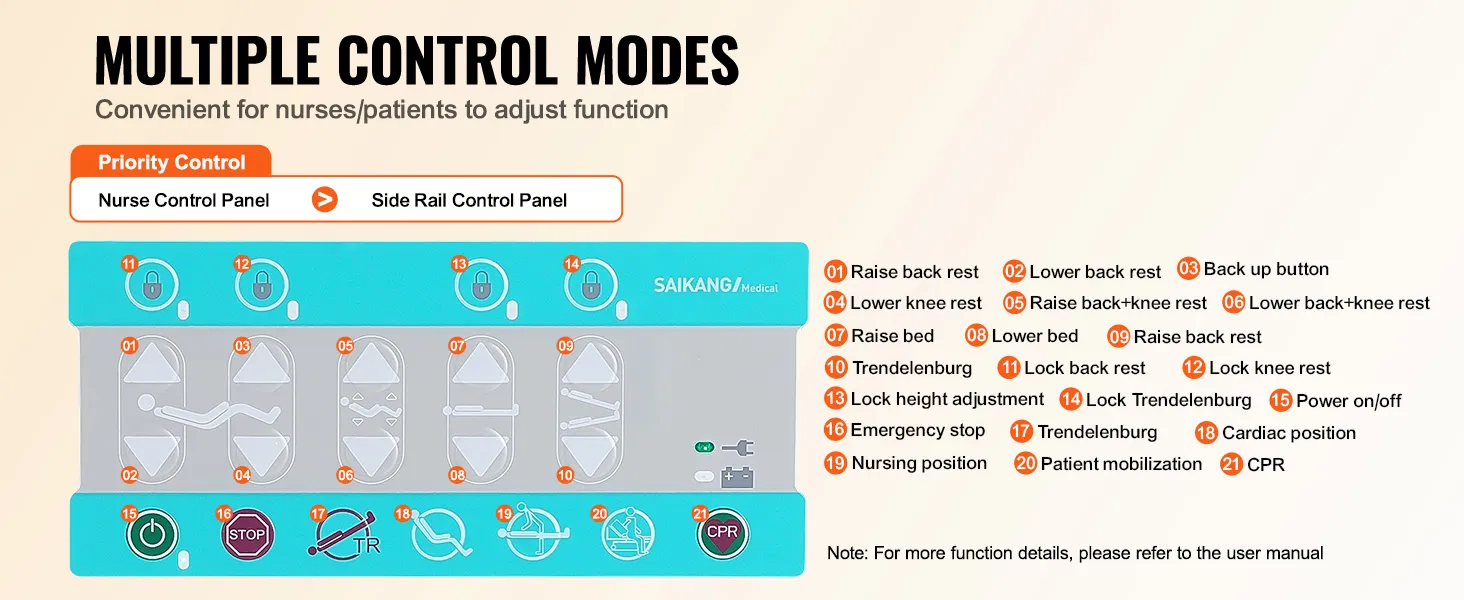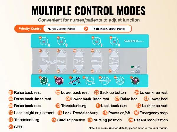 Experience unparalleled convenience with our 5-function full electric hospital bed, featuring 2 control options. Choose from the nurse control panel or side rail control panel for seamless adjustments of all bed functions.