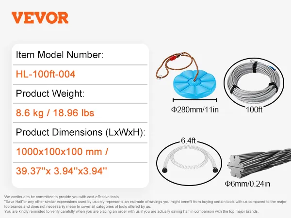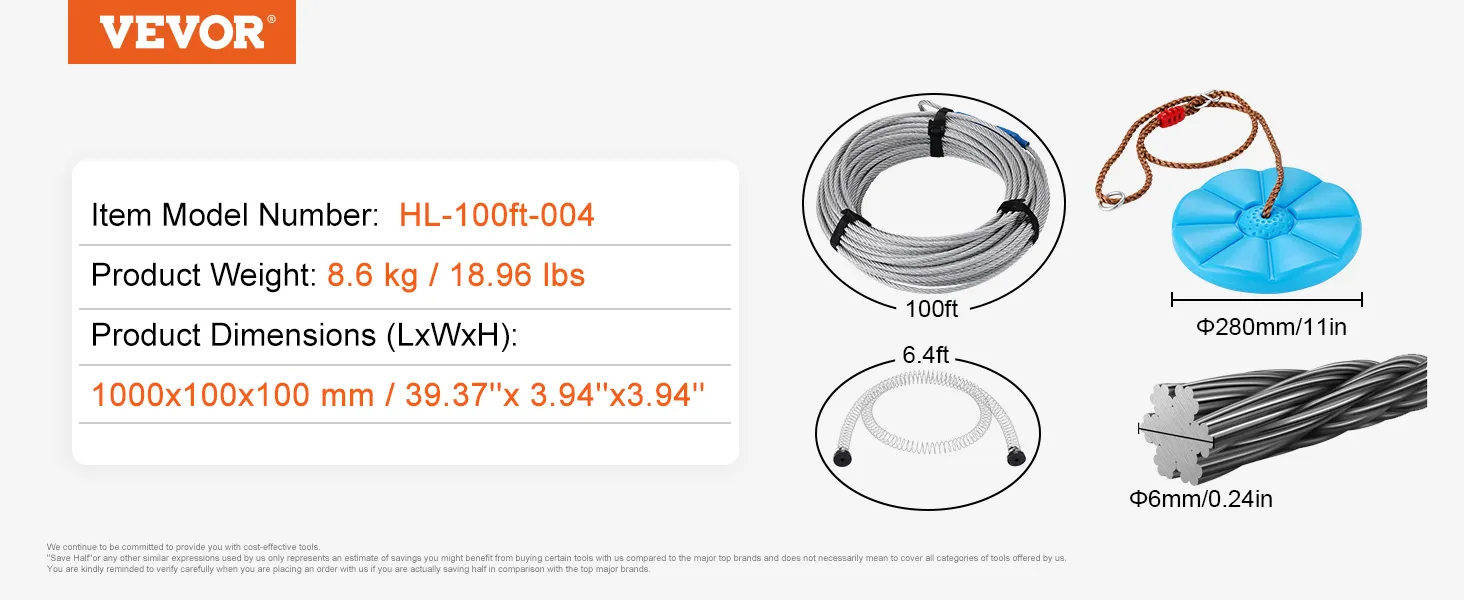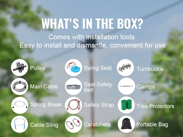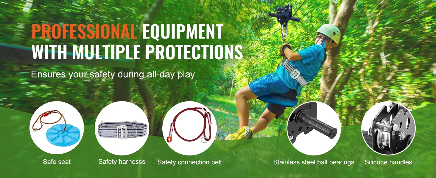 De kit bevat alles wat u nodig hebt voor een complete set-up. Het bevat een roestvrijstalen zipline, veerrem, veiligheidsharnas en stoel. De uitgebreide aard van de VEVOR zipline kit zorgt ervoor dat u geen extra apparatuur hoeft te kopen. Dit gemak maakt het gemakkelijk om direct aan de slag te gaan. Alle meegeleverde gereedschappen en instructies maken het installatieproces eenvoudig en efficiënt. Deze uitgebreide kit garandeert dat u alles hebt wat nodig is voor een effectieve en veilige zipline-ervaring.