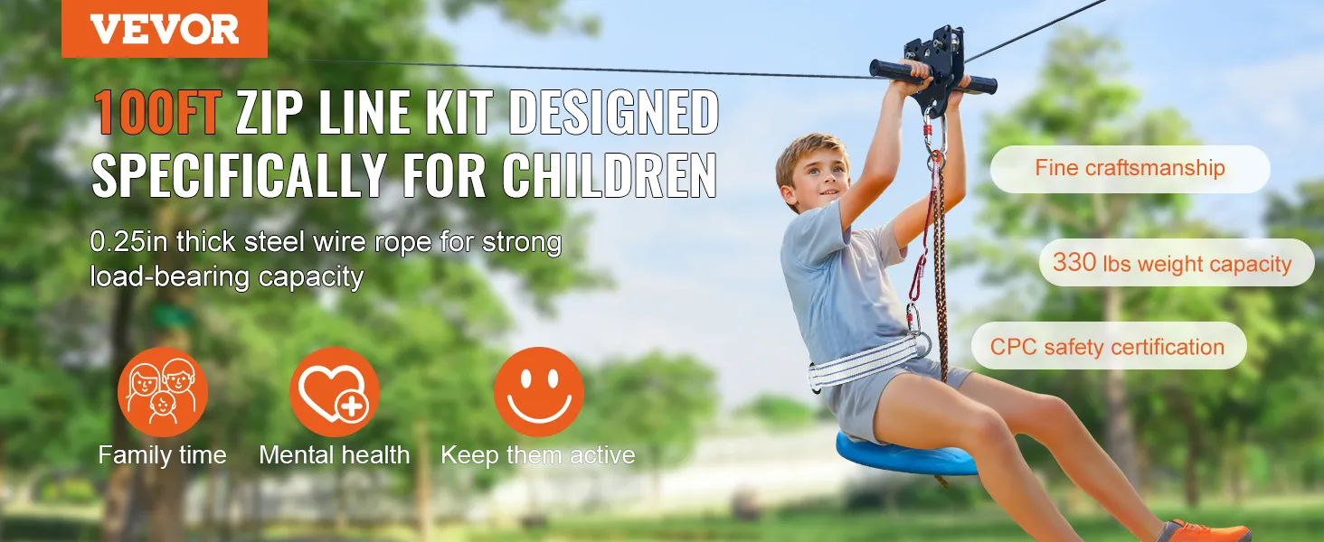 Hoge veerkracht: deze outdoor zipline-set is speciaal ontworpen voor kinderen om te oefenen en te spelen. De staaldraadkabel is verdikt tot 6,35 mm (0,25 inch) en heeft een maximaal draagvermogen van 150 kg (330 lbs). Duurzame materialen en een roestvrijstalen veerremsysteem zorgen voor een veilige fundering. De ziplinekit is CPC-gecertificeerd, waardoor ouders er gerust op kunnen zijn dat ze hun kinderen veilig kunnen begeleiden.