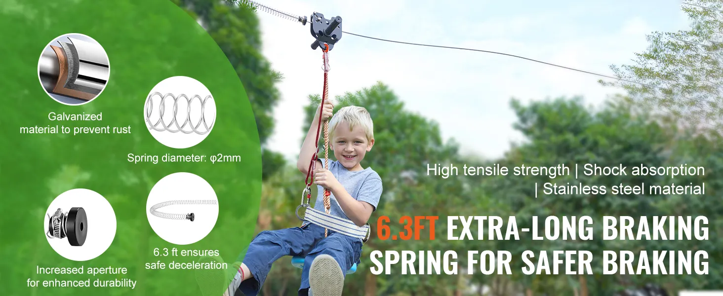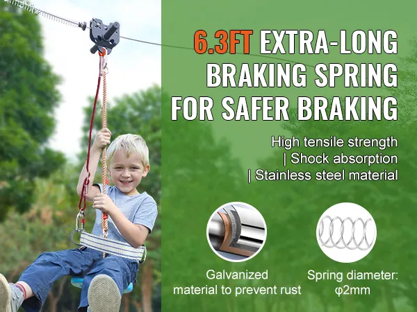 Geavanceerd veerremsysteem: de extra lange veerrem van 195,07 cm (6,4 voet), gemaakt van roestvrij staal met gemiddelde hardheid, zorgt voor meer veerkracht en duurzaamheid. Het voorkomt dat de glijbaan plotseling stopt. Het veerremsysteem houdt de afstand tussen de kinderen en de bomen, waardoor de veiligheid wordt gegarandeerd.