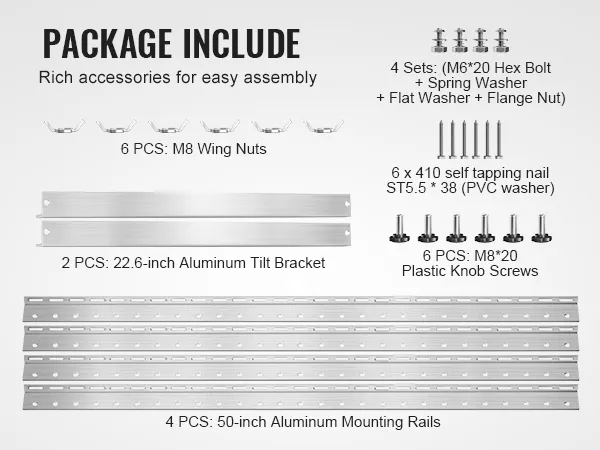 Eenvoudige installatie: deze zonnepaneelhouder ondersteunt zowel horizontale als verticale installatie. Het beschikt over nauwkeurig voorgeboorde gaten en bevat handige accessoires zoals M8 plastic knoopschroeven en M8 vleugelmoeren, waardoor een snelle en eenvoudige installatie wordt gegarandeerd.