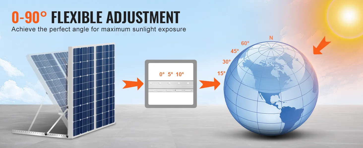 VEVOR montagebeugels voor zonnepanelen zijn ontworpen met een flexibele aanpassing van 0-90°, waardoor u eenvoudig de hoek kunt aanpassen om maximaal zonlicht op te vangen en de energie-efficiëntie aanzienlijk te verhogen.