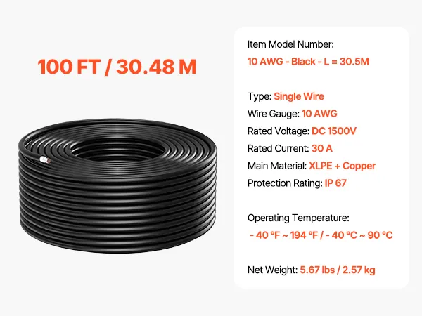 Draaddikte 6mm²/10AWG: Deze kabel is ontworpen voor hoogrenderende zonne-energiesystemen en voldoet aan internationale normen. Met een lengte van 30,48 m hebt u voldoende flexibiliteit voor doe-het-zelf-zonne-aansluitingen, of het nu in uw camper, boot, op uw dak of off-grid-systeem is.