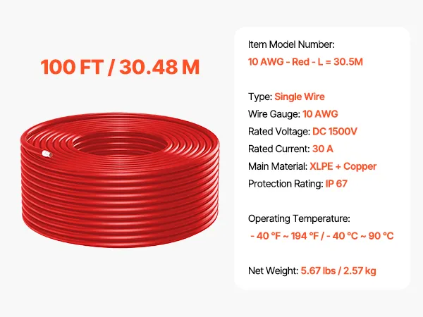 Draaddikte 6mm²/10AWG: Deze kabel is ontworpen voor hoogrenderende zonne-energiesystemen en voldoet aan internationale normen. Met een lengte van 30,48 m hebt u voldoende flexibiliteit voor doe-het-zelf-zonne-aansluitingen, of het nu in uw camper, boot, op uw dak of off-grid-systeem is.
