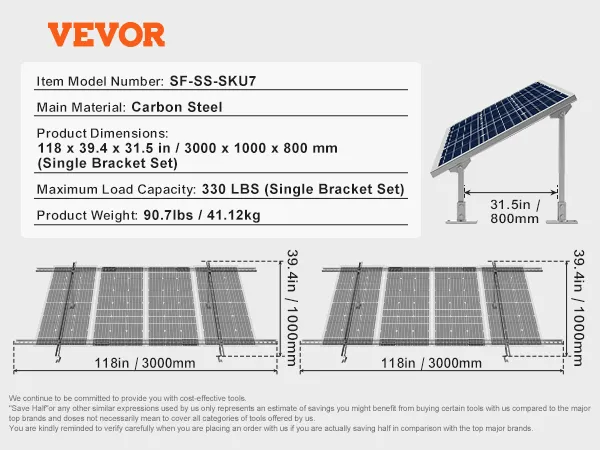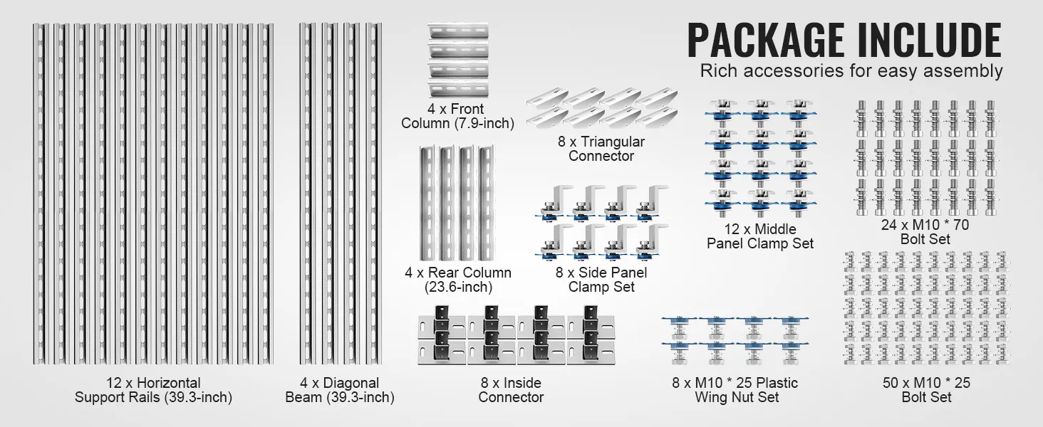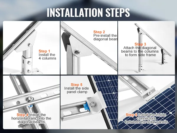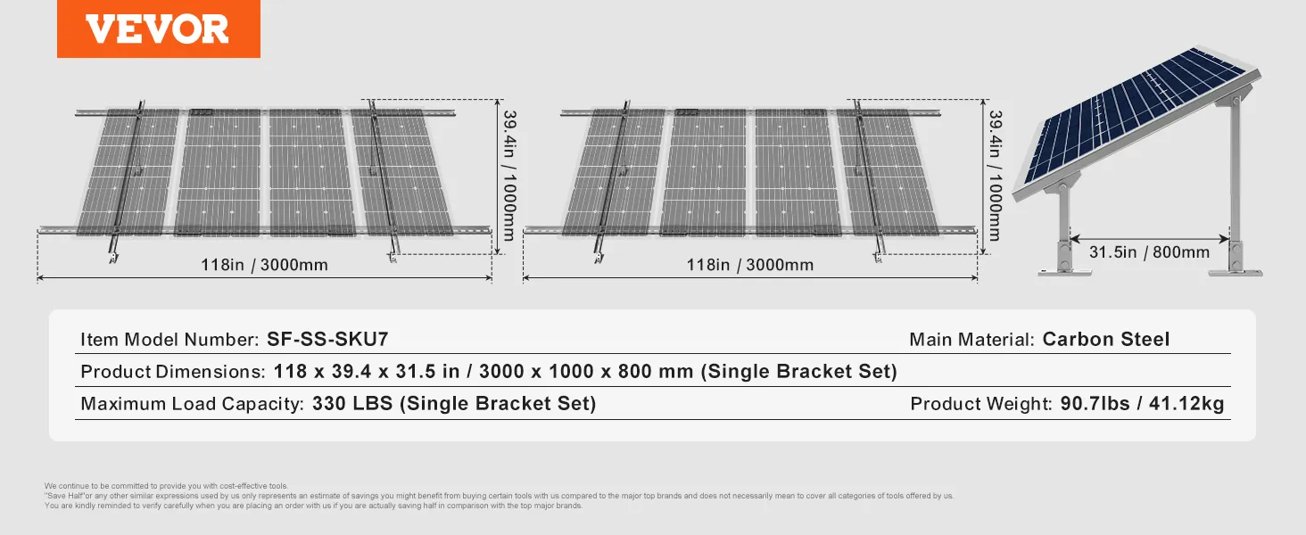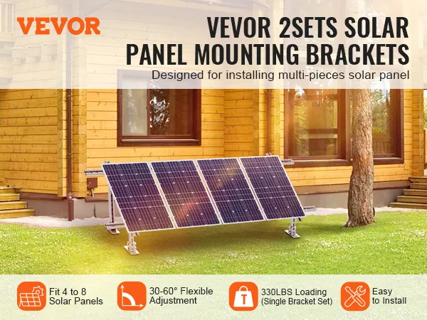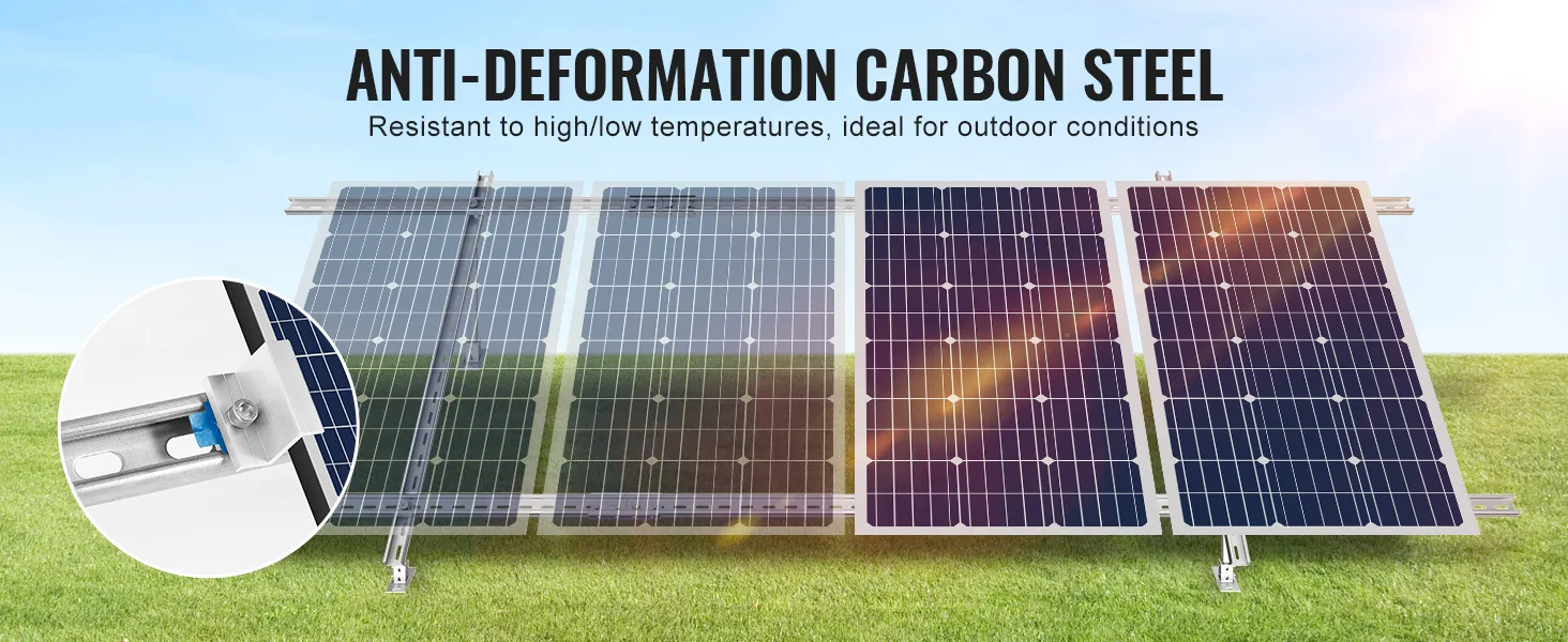 Veelzijdige toepasbaarheid: VEVOR 2 sets meerdelige montagebeugels voor zonnepanelen ondersteunen de installatie van 4 tot 8 zonnepanelen. Aanbevolen installatiegroottes: 4 modules (19,7 - 29,5 inch / ca. 50 - 75 cm; 100 W - 200 W), 3 modules (29,5 - 39,3 inch / ca. 75 - 100 cm; 200 W - 300 W) en 2 modules (39,4 - 58,3 inch / 100 - 148 cm; 400 W).