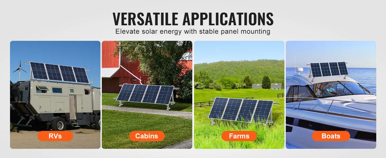 Breed scala aan toepassingen: onze verstelbare montagebeugels voor zonnepanelen zijn veelzijdig, waardoor ze ideaal zijn voor open ruimtes, campers, boten, boerderijen en diverse off-grid-systemen. Ze bieden stabiele ondersteuning, langdurige prestaties en verhogen de efficiëntie van uw zonne-energiesysteem.