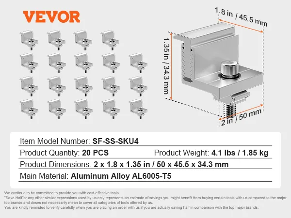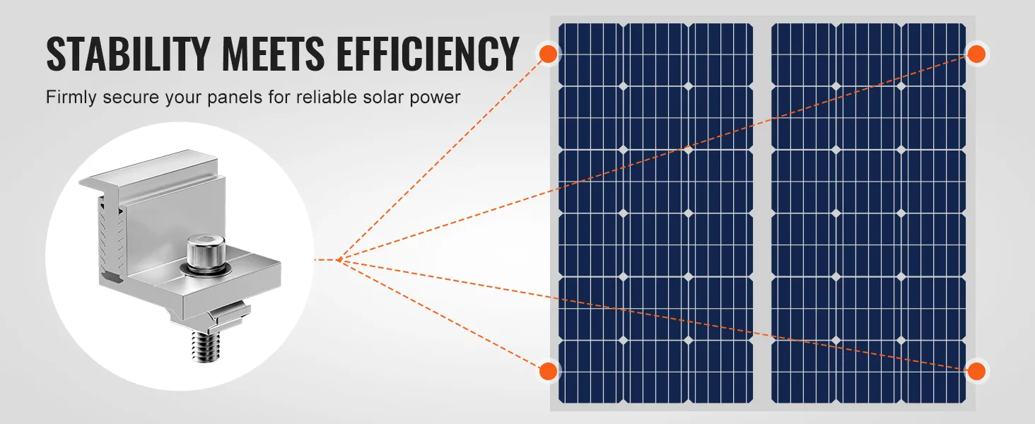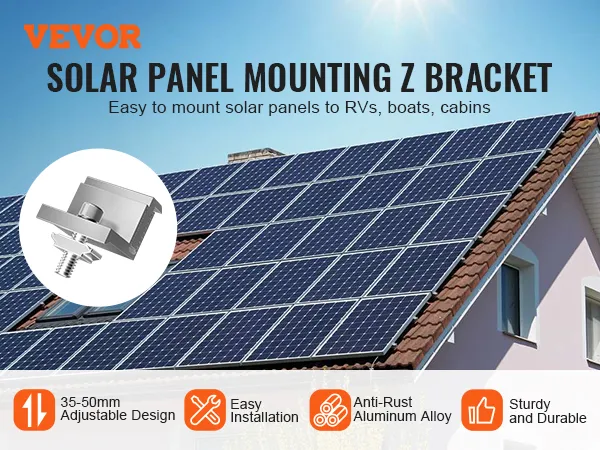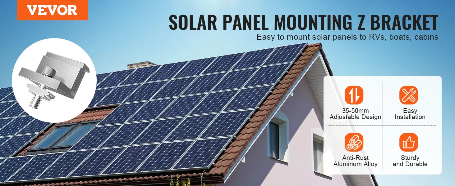 30-50 mm verstelbare eindklem: Dankzij het verstelbare eindklemontwerp kunnen de VEVOR zonnepaneel Z-montagebeugels eenvoudig worden aangepast aan verschillende zonnepaneeldiktes. Ze zijn geschikt voor ingelijste zonnepanelen van 35 tot 50 mm (1,38 tot 1,97 inch).