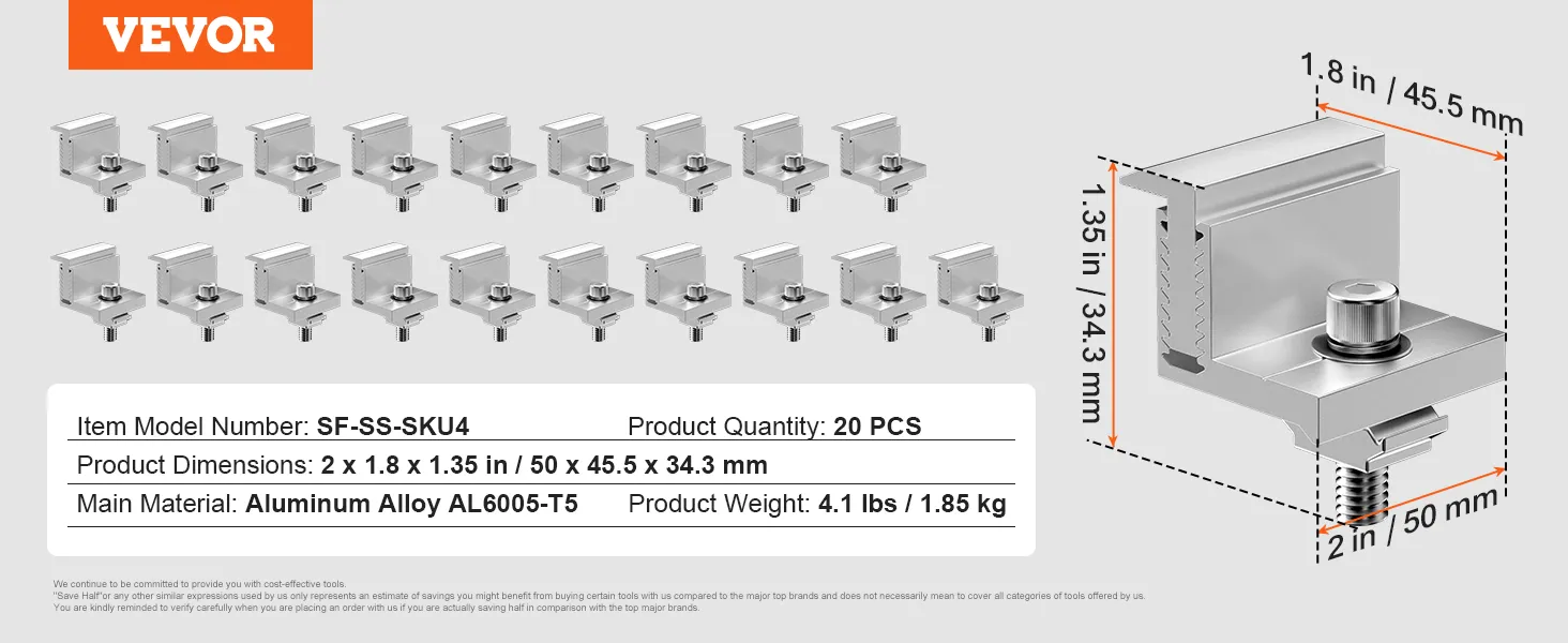 VEVOR 20-delige eindklemmen voor zonnepanelen, 35-50 mm verstelbare zonneklemmen, lichtgewicht geanodiseerde aluminium Z-beugels, montageklemmen voor zonnepanelen voor campers, boten, muren en daken