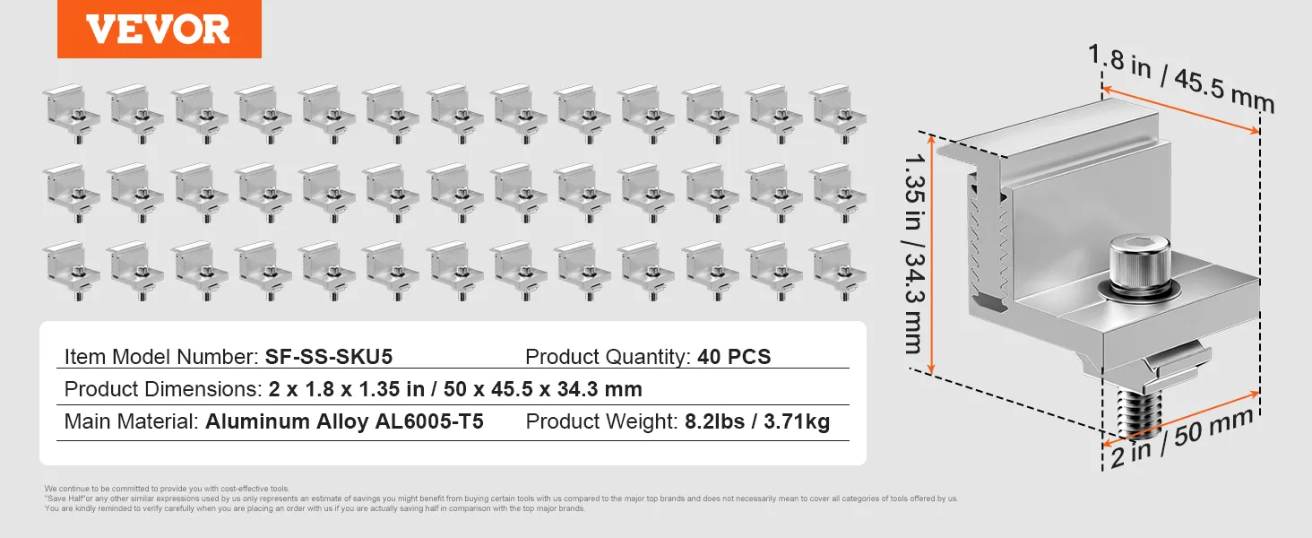 VEVOR 40-delige set eindklemmen voor zonnepanelen, 35-50 mm verstelbare zonneklemmen, lichtgewicht geanodiseerde aluminium Z-beugels, montageklemmen voor zonnepanelen voor campers, boten, muren en daken
