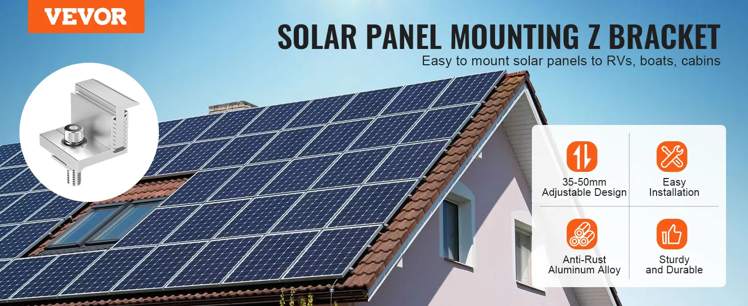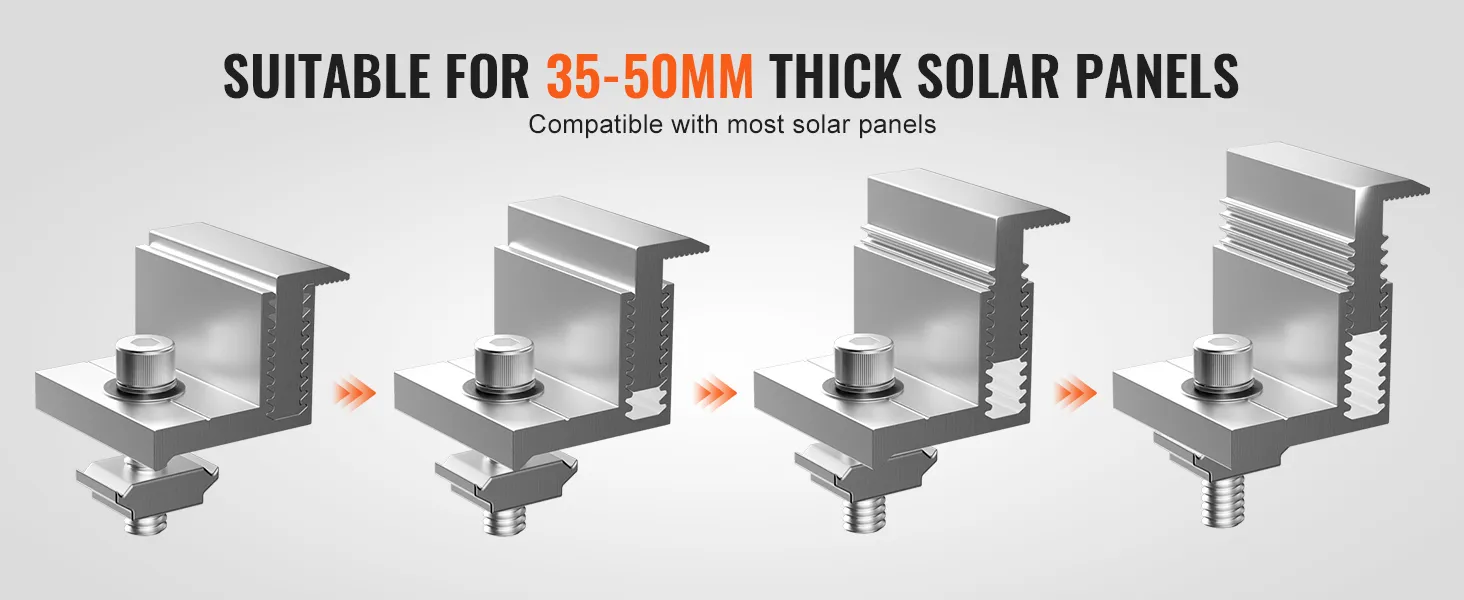 30-50 mm verstelbare eindklem: Dankzij het verstelbare eindklemontwerp kunnen de VEVOR zonnepaneel Z-montagebeugels eenvoudig worden aangepast aan verschillende zonnepaneeldiktes. Ze zijn geschikt voor ingelijste zonnepanelen van 35 tot 50 mm (1,38 tot 1,97 inch).