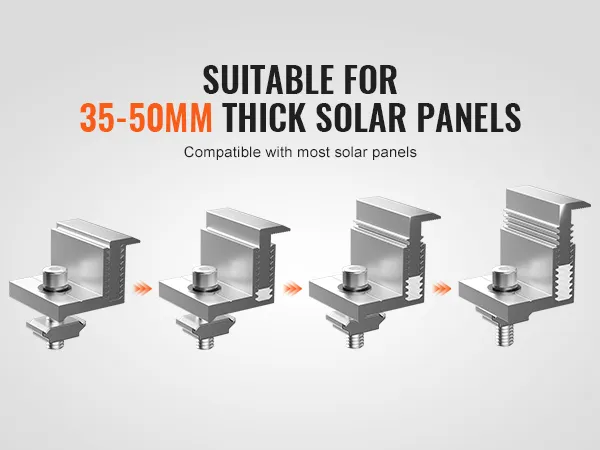 Dankzij het verstelbare eindklemontwerp kunnen de Z-zonnepaneelmontagebeugels eenvoudig worden aangepast aan verschillende zonnepaneeldiktes. Ze zijn compatibel met ingelijste zonnepanelen van 35 tot 50 mm (1,38 tot 1,97 inch).