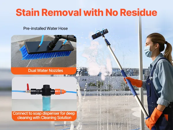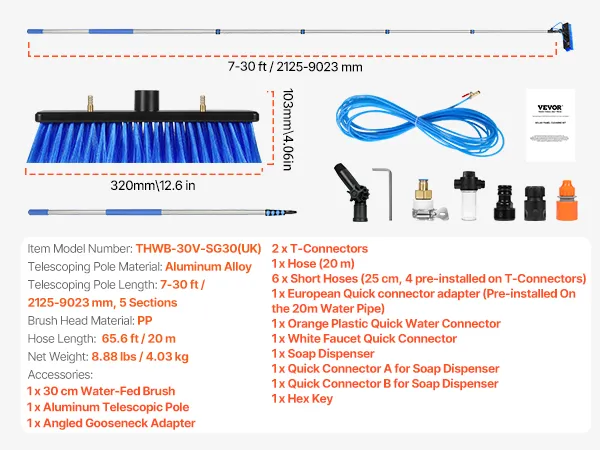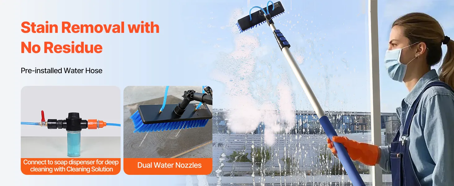Say goodbye to high-altitude cleaning hassles! This water fed pole kit features an adjustable pole that extends up to 9 m, with a 180° rotating head and 2 water jets for thorough cleaning. It includes quick connectors and 20m hose for versatile use, easy to tackle different cleaning tasks.