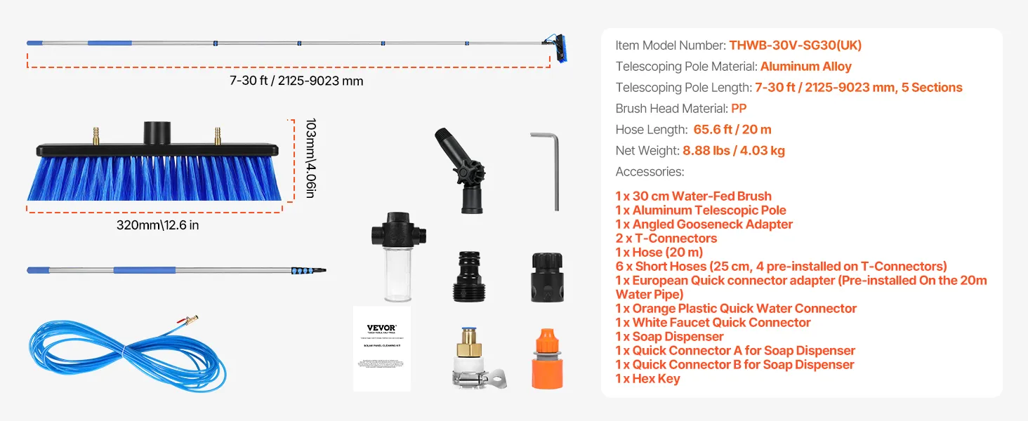 Complete Accessory Set: The water fed pole brush kit includes a 65.6ft (20m) hose for easy connection to the water source. It includes multiple quick attachment to standard garden hoses or pure water systems, making it the perfect solar panel cleaning brush and pole kit for both residential and commercial use.