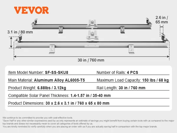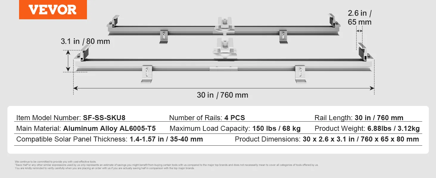 35-40 mm verstelbare eindklem: Dankzij het verstelbare eindklemontwerp kunnen de VEVOR-montagebeugels voor zonnepanelen eenvoudig worden aangepast aan verschillende diktes zonnepanelen. Ze zijn geschikt voor ingelijste zonnepanelen van 35 tot 40 mm (1,38 tot 1,57 inch).