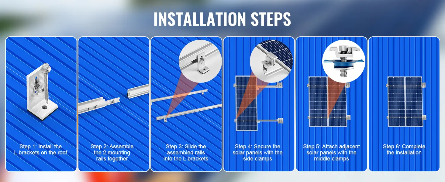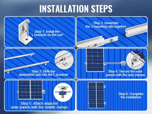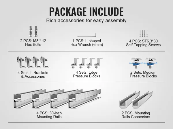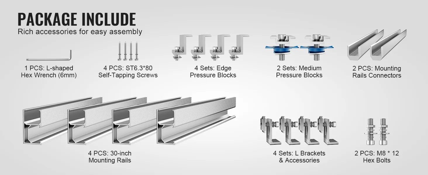 Eenvoudige installatie: deze montageset voor zonnepanelen wordt geleverd met 4 aluminium rails (30 inch / 760 mm), 4 eindklemmen en 2 lichtgewicht klemmen, een set accessoires en een gedetailleerde handleiding, die een snelle installatie garanderen. Gebruikers kunnen het eenvoudig instellen en genieten van stabiele, betrouwbare ondersteuning voor hun zonne-energiesysteem.