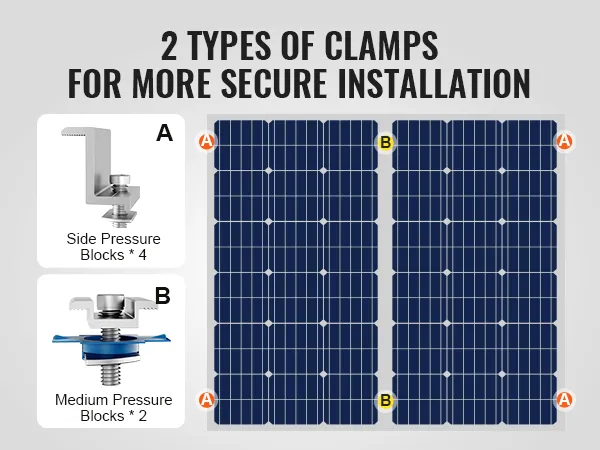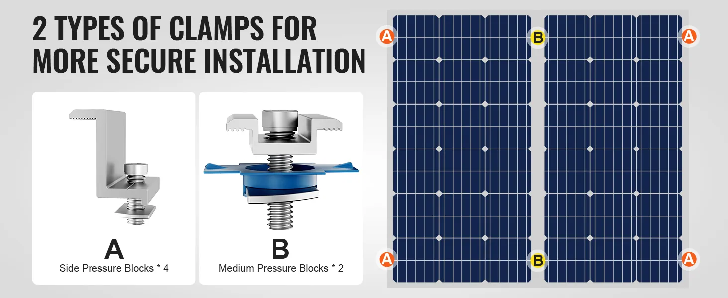 Deze montageset bevat twee soorten klemmen. Twee middenklemmen houden aangrenzende panelen bij elkaar en vier eindklemmen bieden extra ondersteuning door de randen van de panelen vast te zetten, zodat uw zonnepaneel stevig op zijn plaats zit.