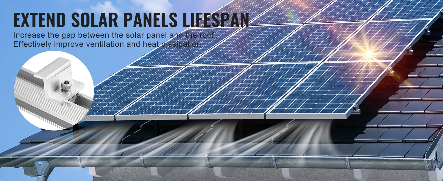 Waarom kiezen voor de VEVOR montagebeugel voor zonnepanelen? Het vergroten van de afstand tussen het zonnepaneel en het dak verbetert effectief de ventilatie en warmteafvoer, voorkomt oververhitting en verlengt de levensduur van uw zonnepanelen.