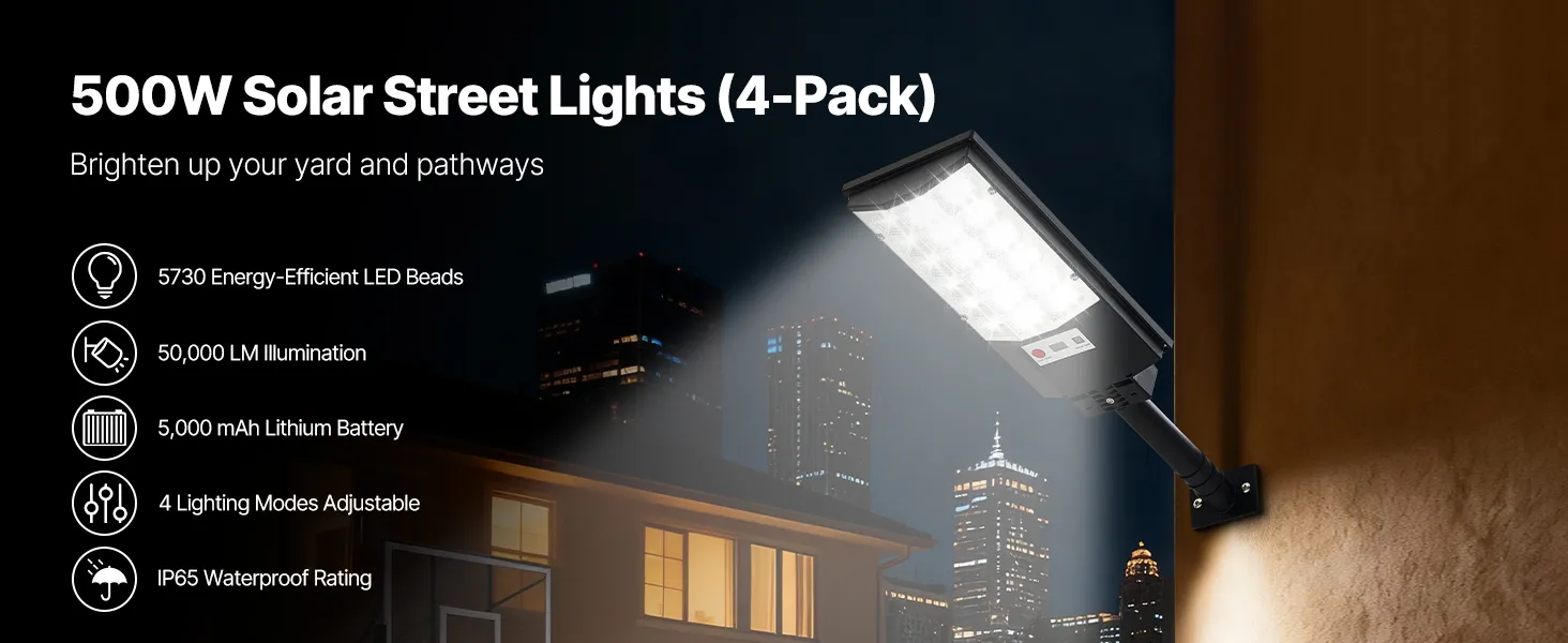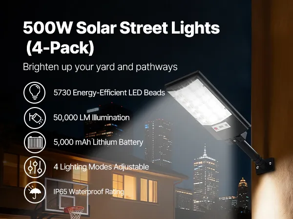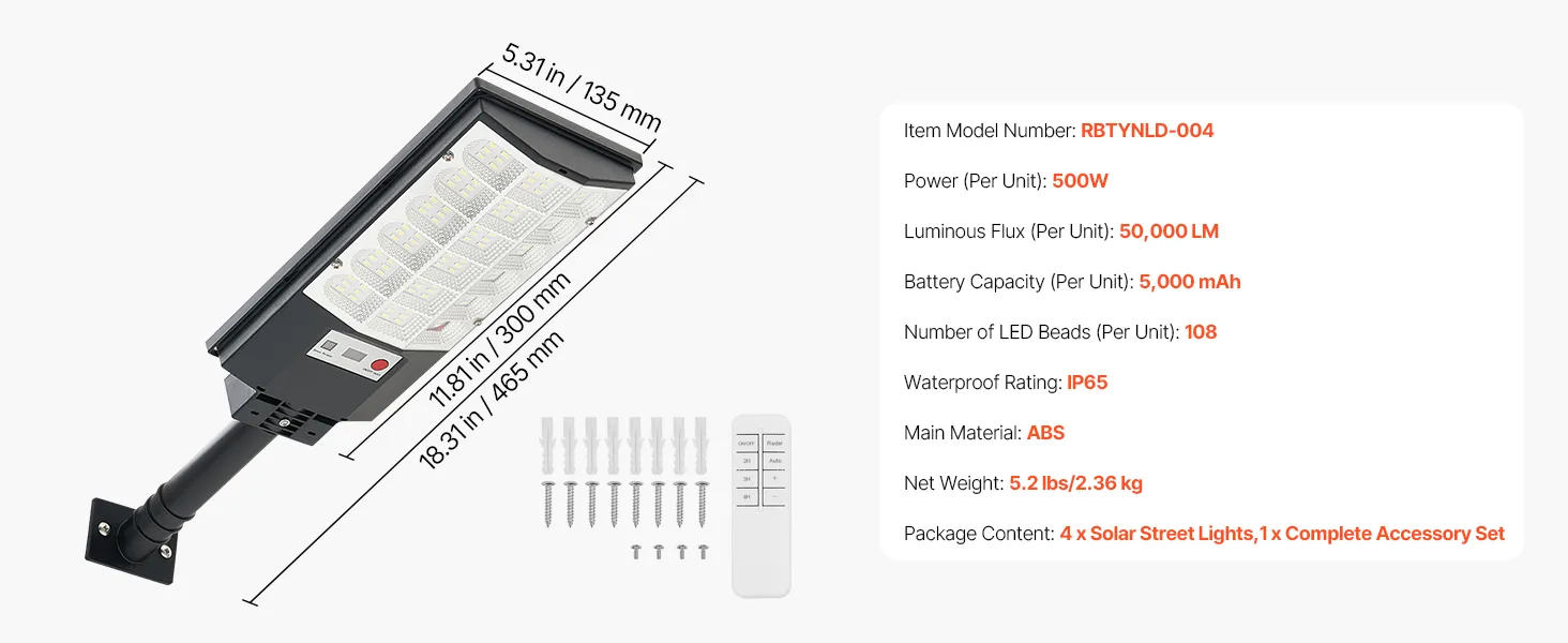 Heldere straatverlichting op zonne-energie: Deze 500W straatverlichting op zonne-energie is uitgerust met 5730 krachtige LED's en levert een krachtige lichtbundel van 240° met een indrukwekkende lichtopbrengst van 50.000 lumen. Verlicht elke hoek van uw tuin.