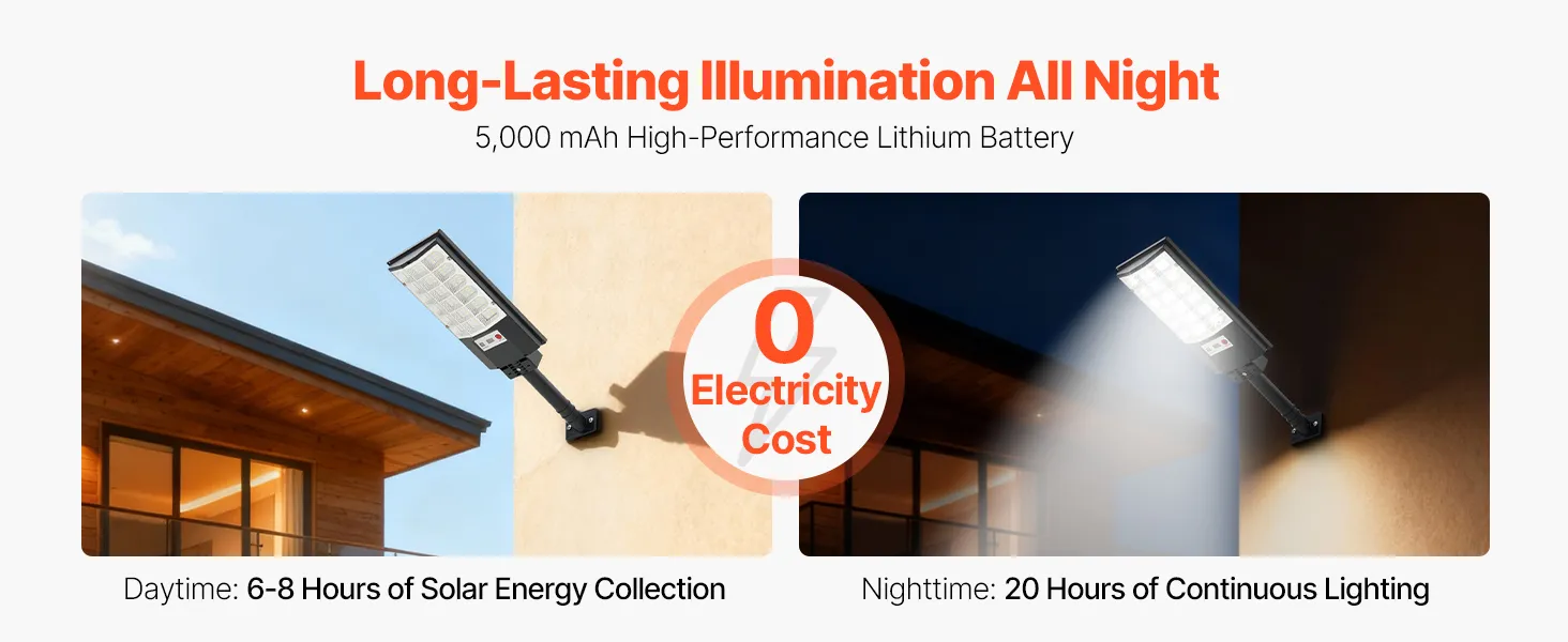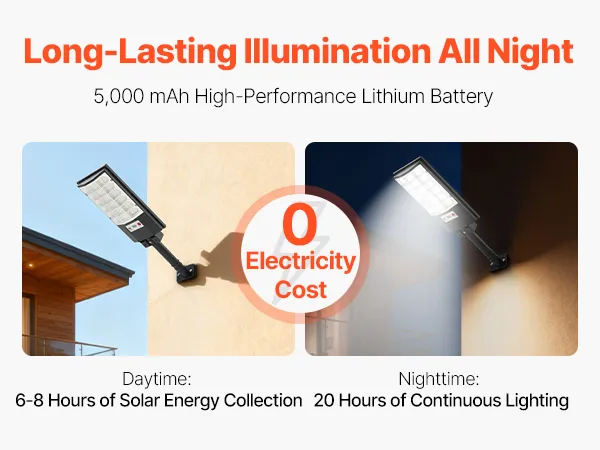 Verlichting op zonne-energie: Onze straatlantaarn werkt volledig op zonne-energie. Overdag vangt hij zonlicht op en slaat dit op in een lithiumbatterij van 5000 mAh. Eenmaal volledig opgeladen, geeft hij 's nachts tot wel 20 uur continu licht.